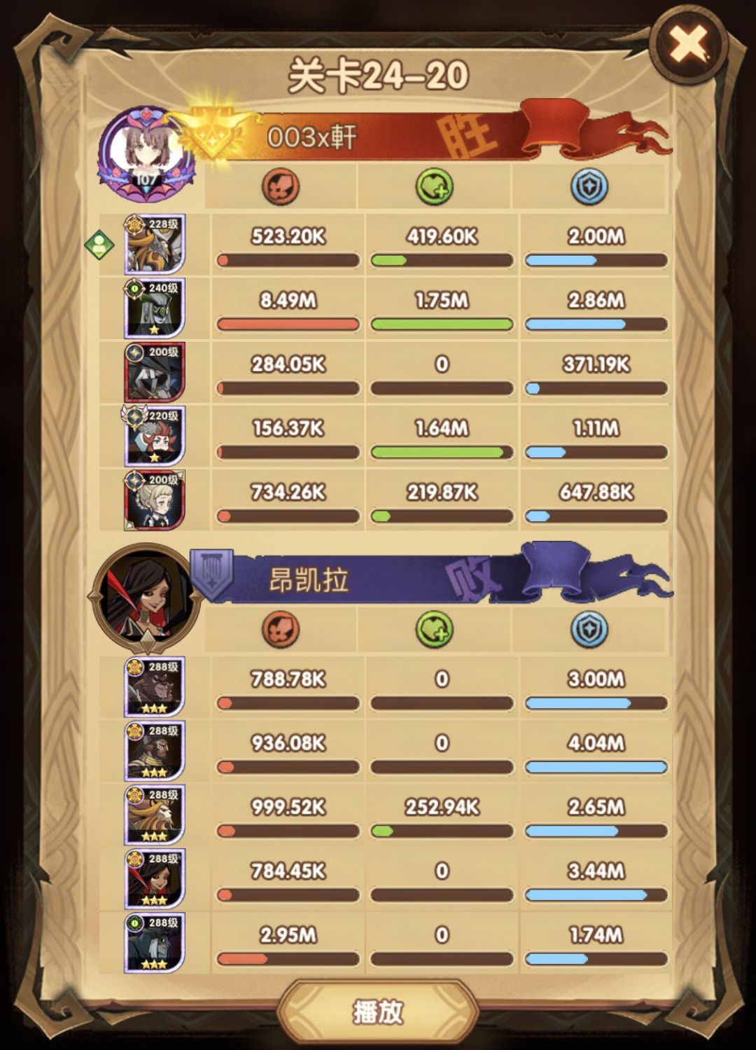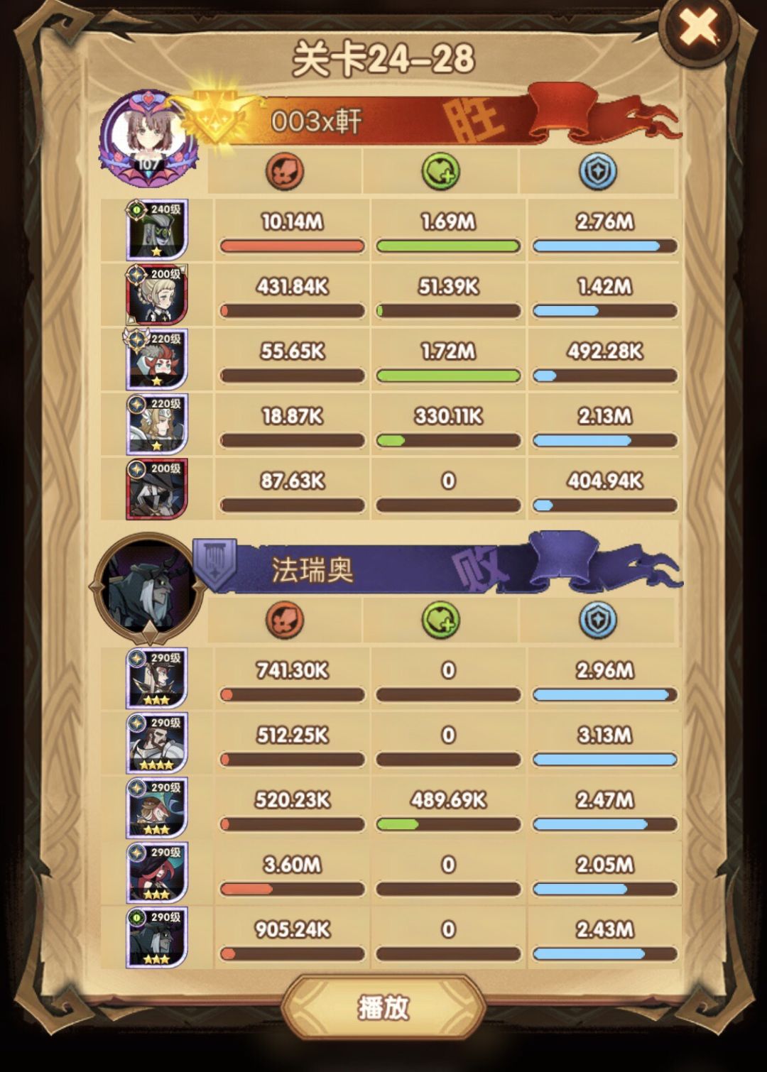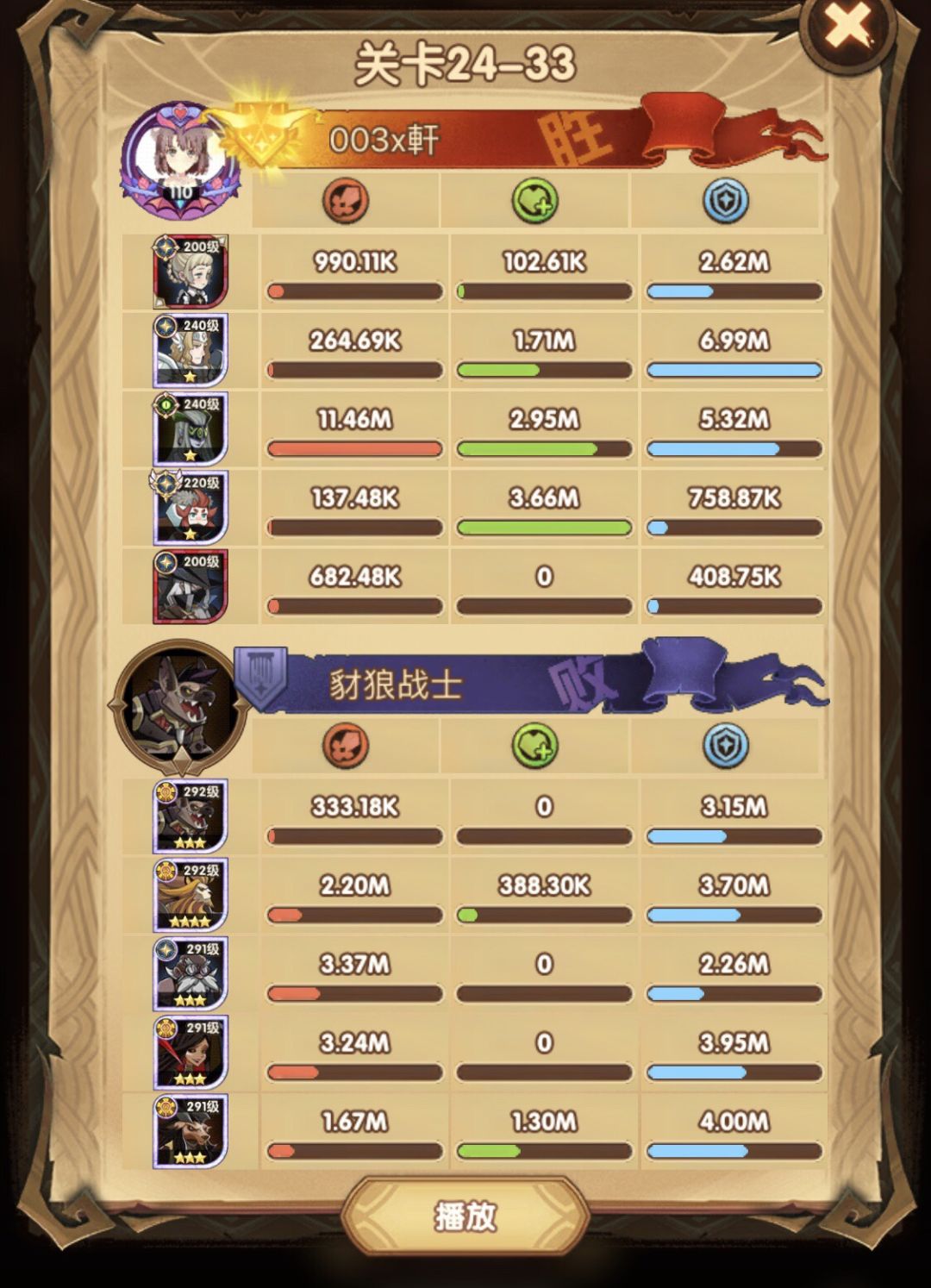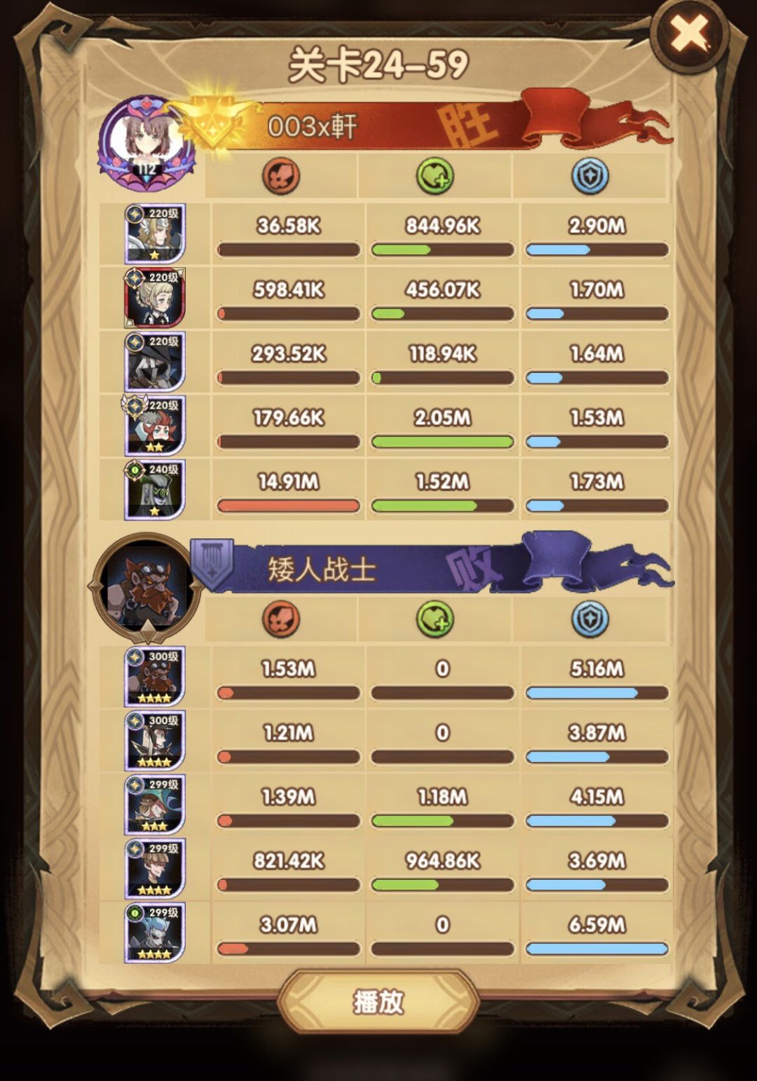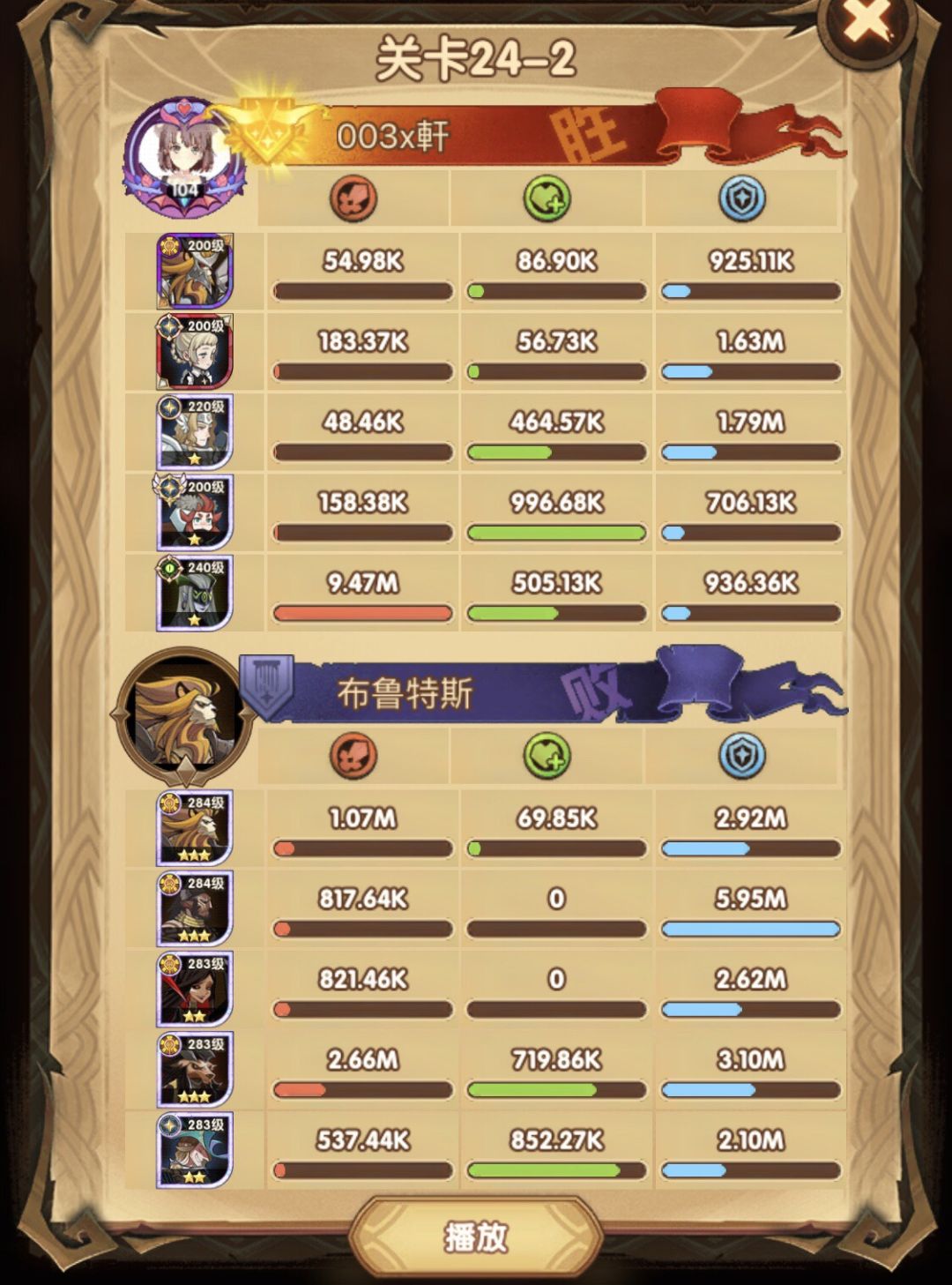 24-20 借了个狮子,还是re了一百多次才过😂 可能大家想问 这关为什么要借狮子,狮子不是工具人吗?七秒真男人存在什么品质差距?借狮子有啥用? 但实际上,这关的我能不能过的区别在于,啪啪熊能不能把狮子背到后面去!能把狮子背过去的话,上面那三个人都会跑过去打狮子,这才能给女妖女仆双大留下足够时间,因为他们要跑路啊,就差这么一点点的时间,足够商人放二大来晕住,或者让他们死在女妖二大的路上提前触发对面狮子的不屈。然后狮子的差距在哪里,说白了就是借的狮子血多一点,我的紫加狮子一碰就会不屈,而狮子在不屈期间是免疫控制的,也就是说没法被背到后面去,借的狮子能稍微抗两下再不屈,这是差别。(当然过程也没有这么顺利,比如棺材看心情关骨弓,比如女仆看心情开大……)