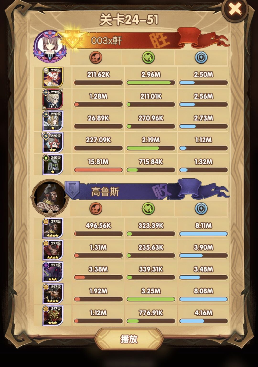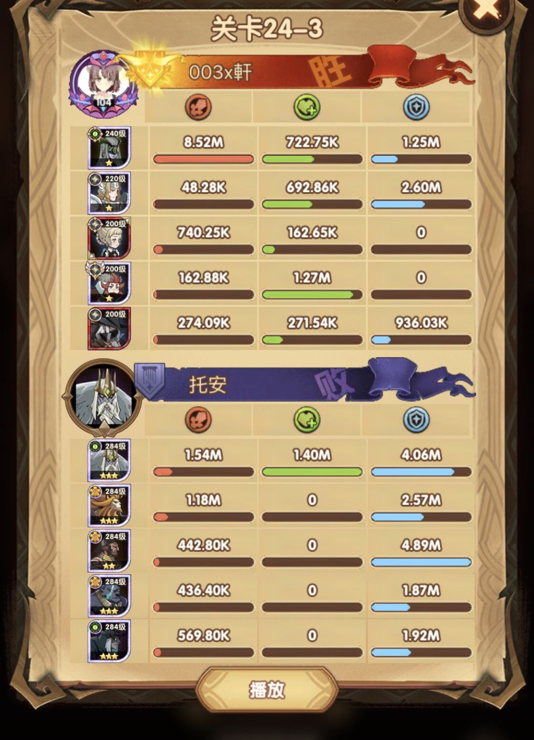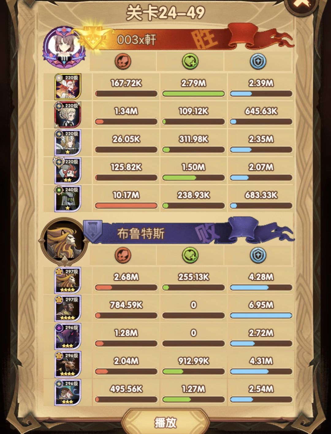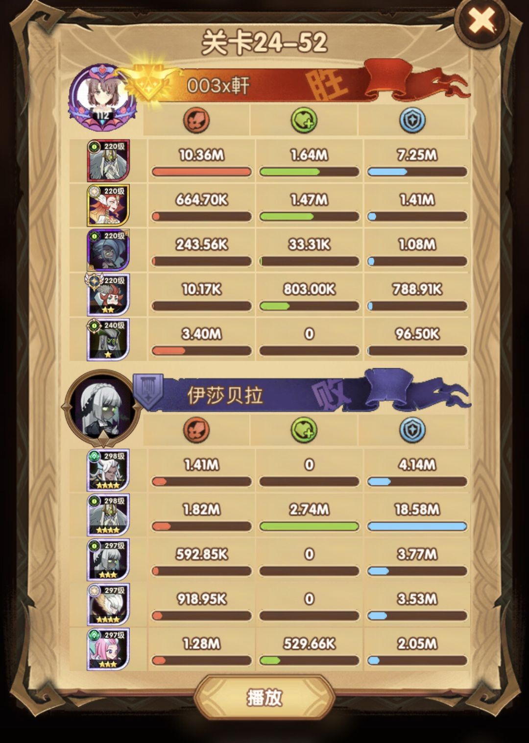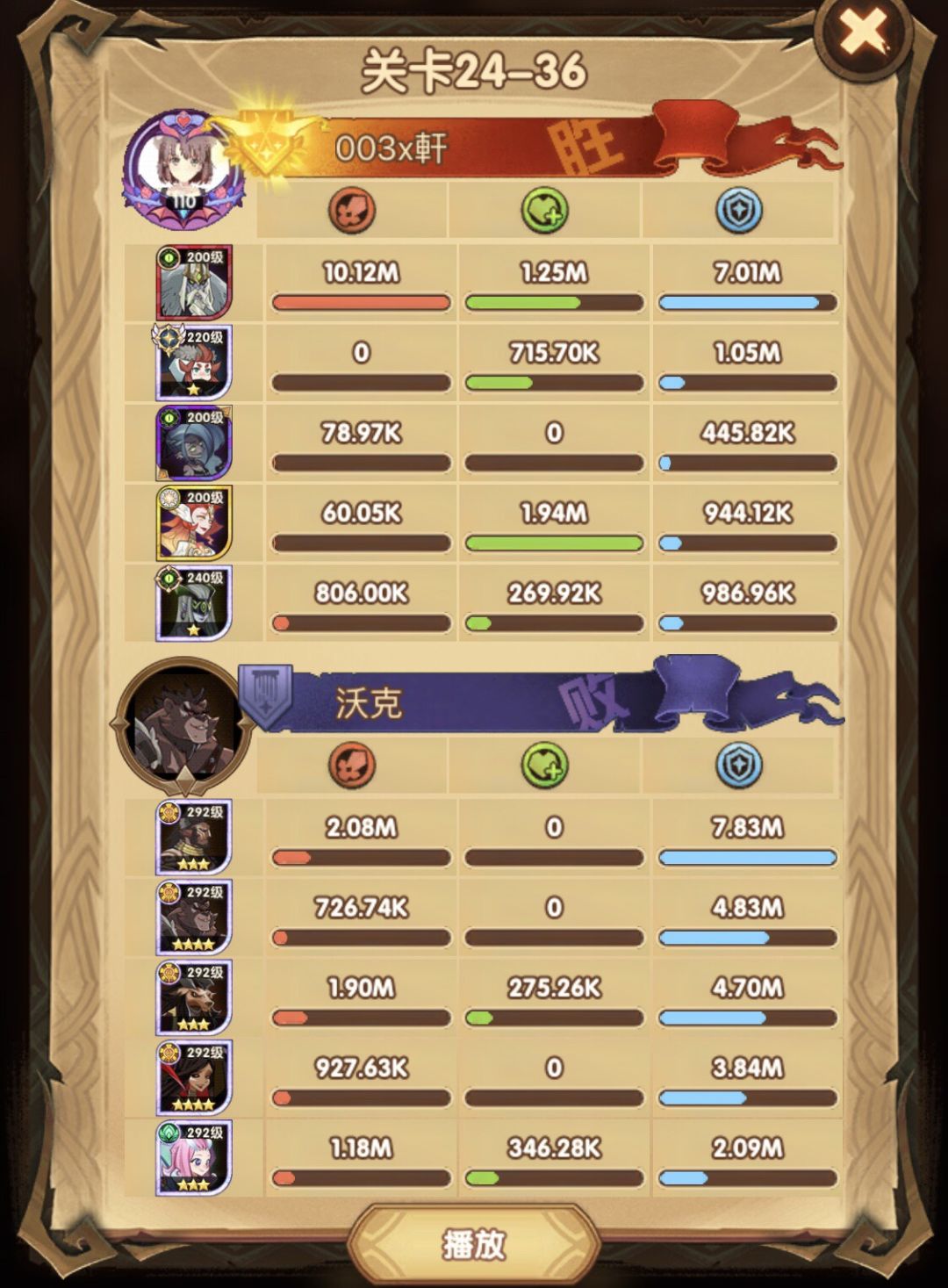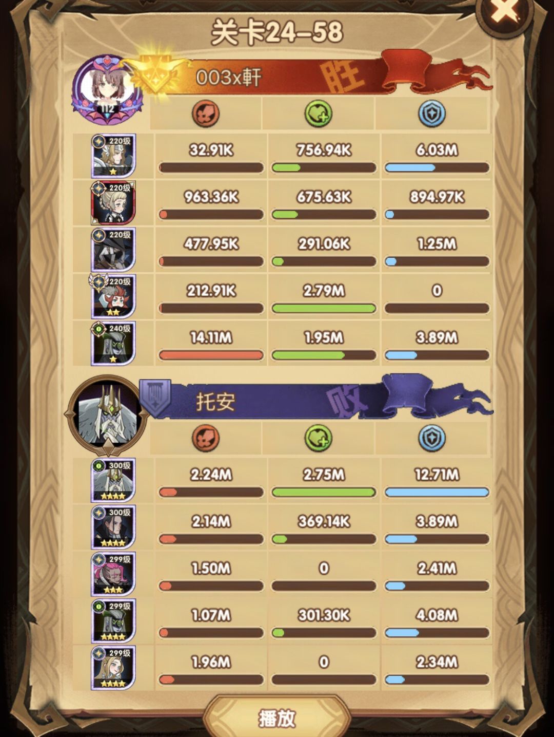24-20 借了个狮子,还是re了一百多次才过😂 可能大家想问 这关为什么要借狮子,狮子不是工具人吗?七秒真男人存在什么品质差距?借狮子有啥用? 但实际上,这关的我能不能过的区别在于,啪啪熊能不能把狮子背到后面去!能把狮子背过去的话,上面那三个人都会跑过去打狮子,这才能给女妖女仆双大留下足够时间,因为他们要跑路啊,就差这么一点点的时间,足够商人放二大来晕住,或者让他们死在女妖二大的路上提前触发对面狮子的不屈。然后狮子的差距在哪里,说白了就是借的狮子血多一点,我的紫加狮子一碰就会不屈,而狮子在不屈期间是免疫控制的,也就是说没法被背到后面去,借的狮子能稍微抗两下再不屈,这是差别。(当然过程也没有这么顺利,比如棺材看心情关骨弓,比如女仆看心情开大……)