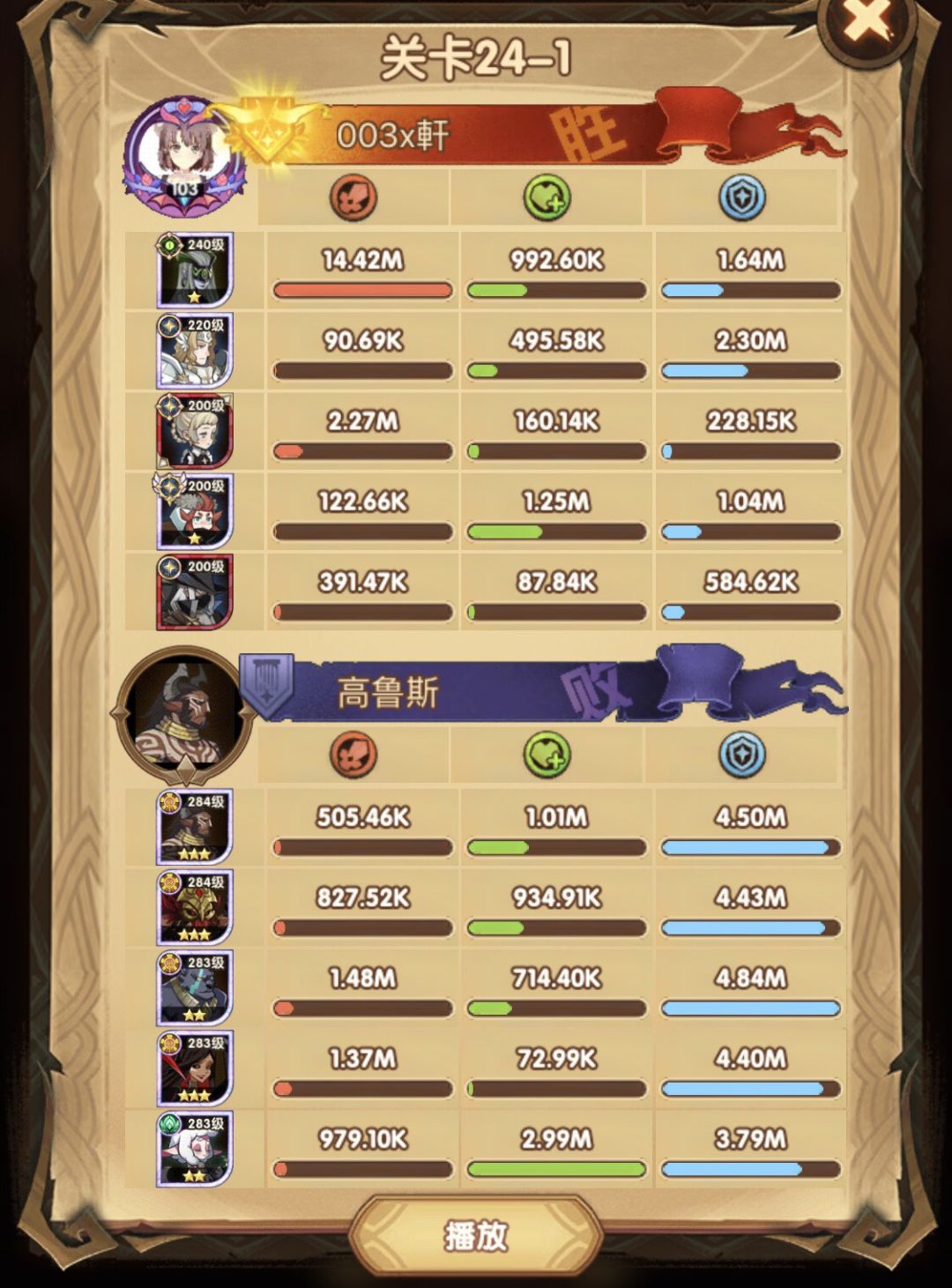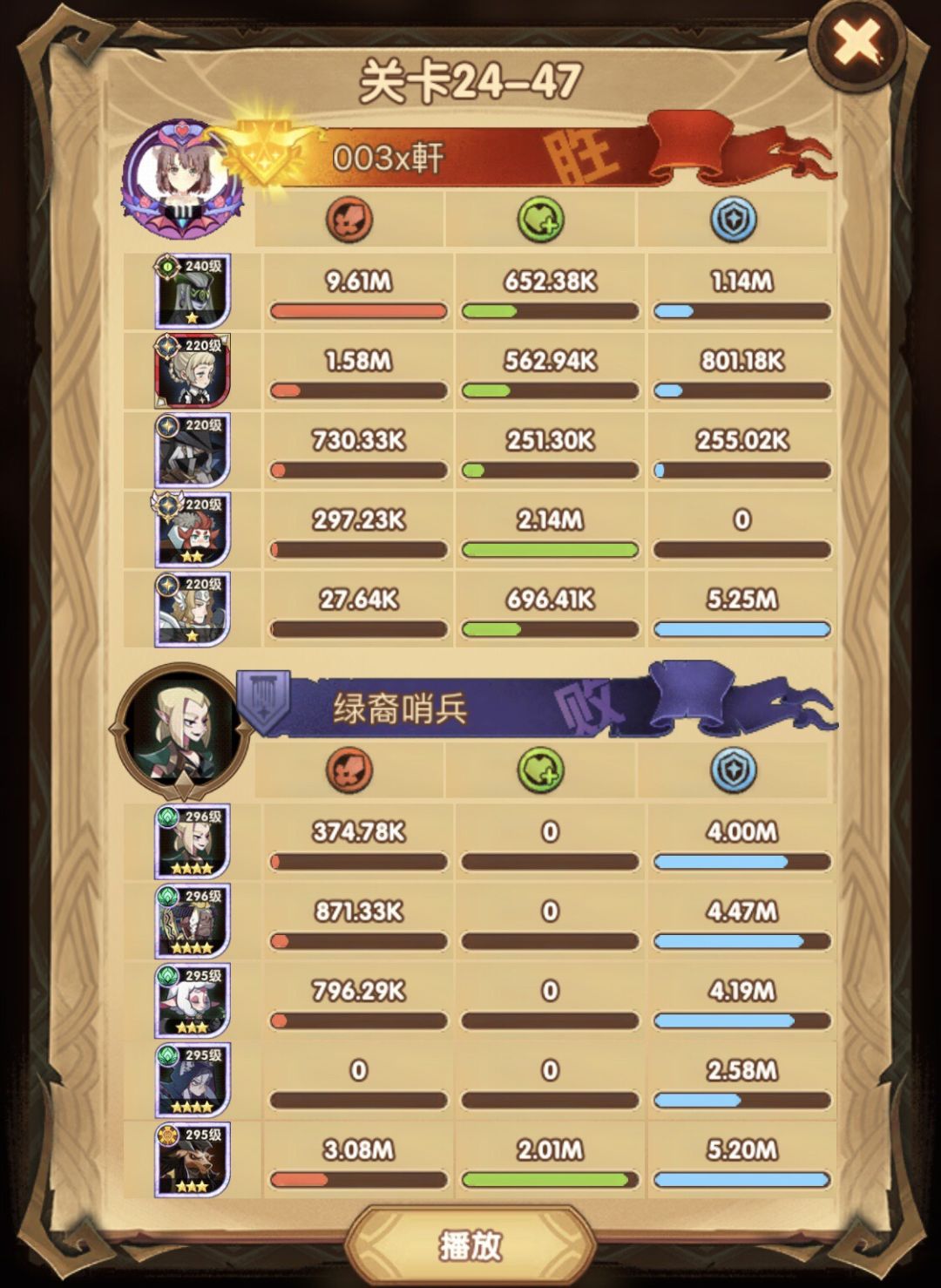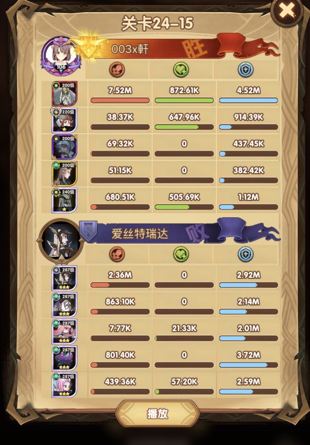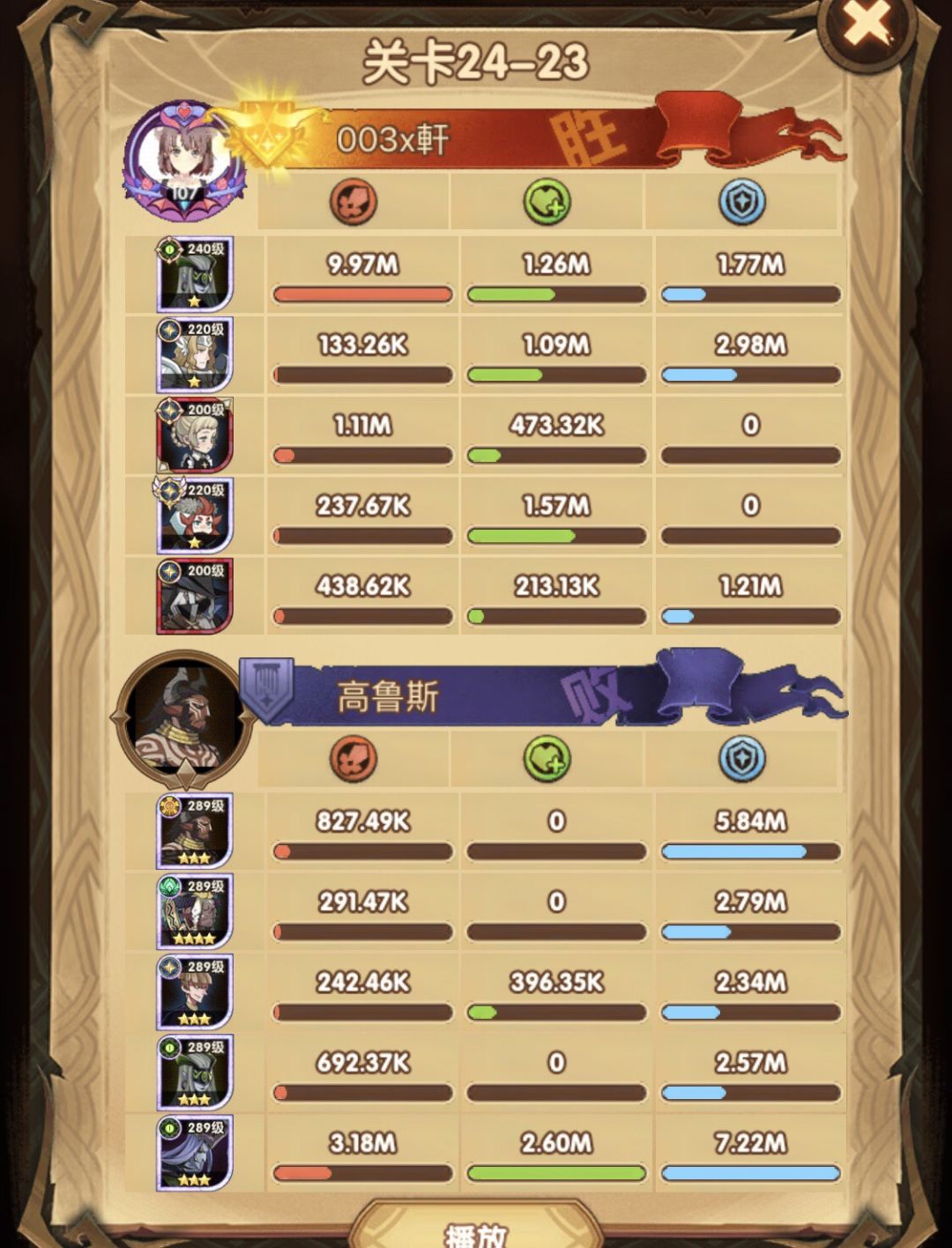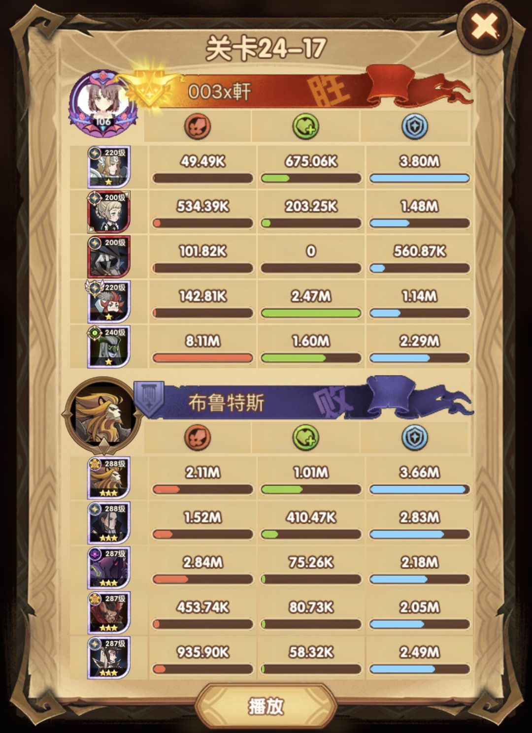24-20 借了个狮子,还是re了一百多次才过😂 可能大家想问 这关为什么要借狮子,狮子不是工具人吗?七秒真男人存在什么品质差距?借狮子有啥用? 但实际上,这关的我能不能过的区别在于,啪啪熊能不能把狮子背到后面去!能把狮子背过去的话,上面那三个人都会跑过去打狮子,这才能给女妖女仆双大留下足够时间,因为他们要跑路啊,就差这么一点点的时间,足够商人放二大来晕住,或者让他们死在女妖二大的路上提前触发对面狮子的不屈。然后狮子的差距在哪里,说白了就是借的狮子血多一点,我的紫加狮子一碰就会不屈,而狮子在不屈期间是免疫控制的,也就是说没法被背到后面去,借的狮子能稍微抗两下再不屈,这是差别。(当然过程也没有这么顺利,比如棺材看心情关骨弓,比如女仆看心情开大……)