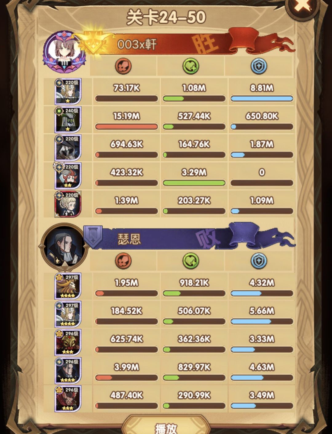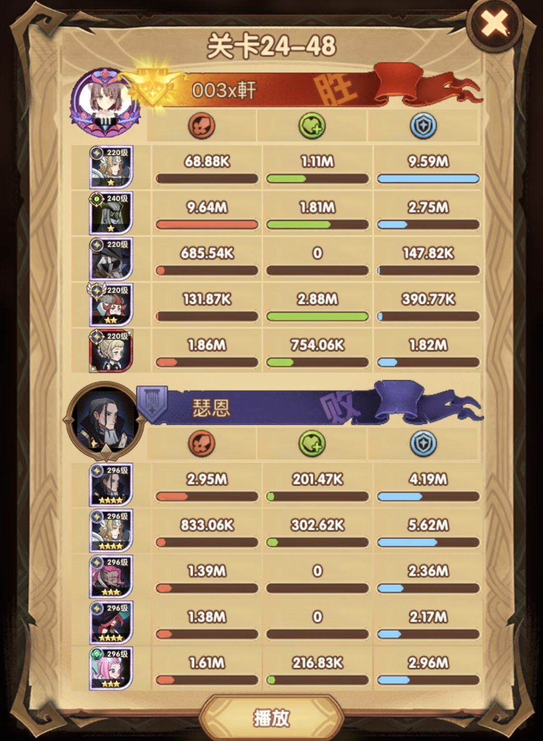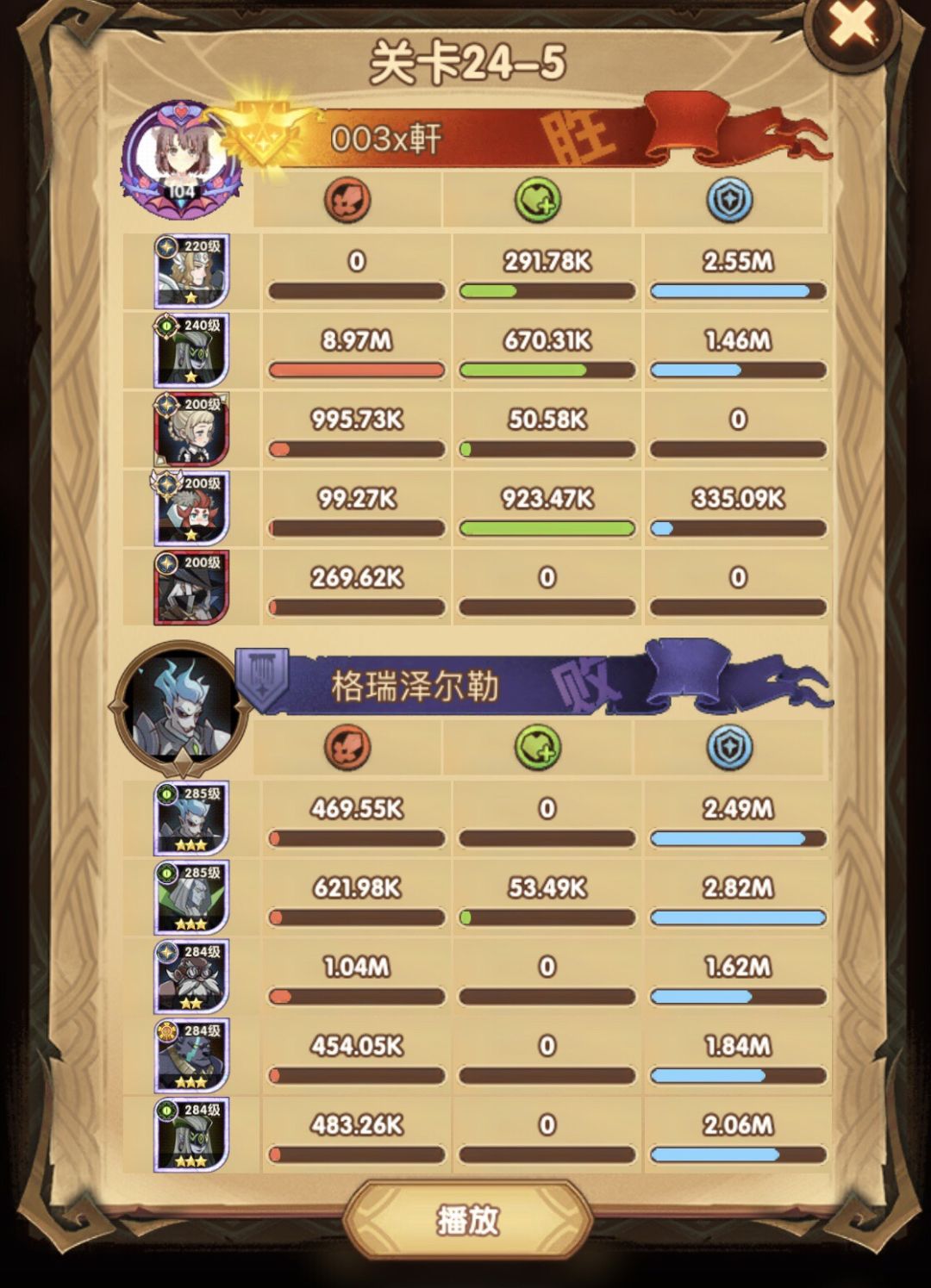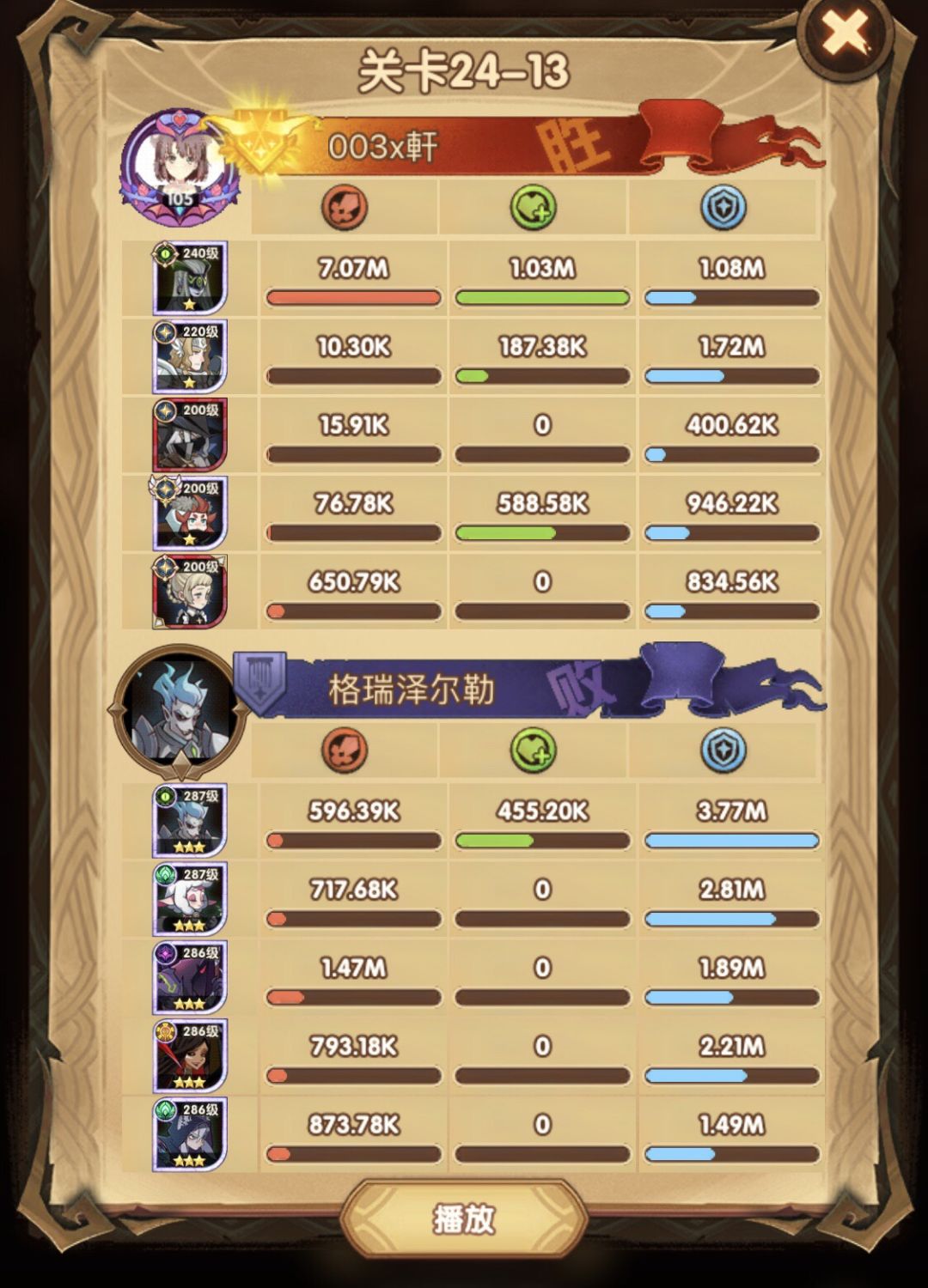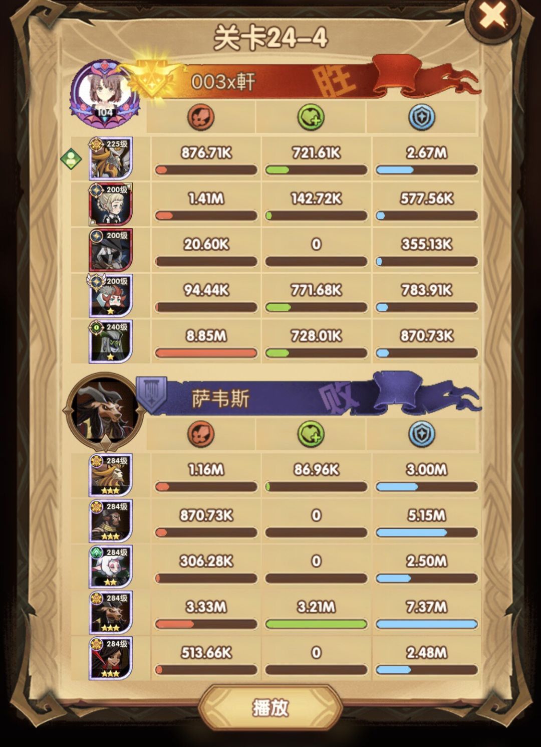 24-20 借了个狮子,还是re了一百多次才过😂 可能大家想问 这关为什么要借狮子,狮子不是工具人吗?七秒真男人存在什么品质差距?借狮子有啥用? 但实际上,这关的我能不能过的区别在于,啪啪熊能不能把狮子背到后面去!能把狮子背过去的话,上面那三个人都会跑过去打狮子,这才能给女妖女仆双大留下足够时间,因为他们要跑路啊,就差这么一点点的时间,足够商人放二大来晕住,或者让他们死在女妖二大的路上提前触发对面狮子的不屈。然后狮子的差距在哪里,说白了就是借的狮子血多一点,我的紫加狮子一碰就会不屈,而狮子在不屈期间是免疫控制的,也就是说没法被背到后面去,借的狮子能稍微抗两下再不屈,这是差别。(当然过程也没有这么顺利,比如棺材看心情关骨弓,比如女仆看心情开大……)