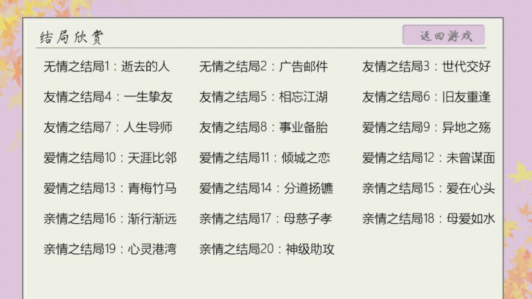 在刷到15个的时候实在刷不动了,就看了几眼攻略_(:з」∠)_这个游戏,不同结局,人物身份和关系都不同诶,导致刚开始玩时一直没分清【我】到底是男是女,,,一会男朋友,一会女朋友的,玩懵233333话说,如图,,我还以为是两个结局,结果第二遍一看。。。不都一个意思吗。。。
