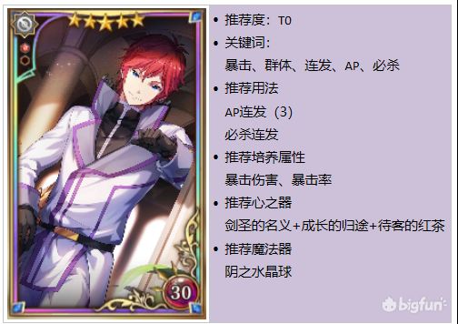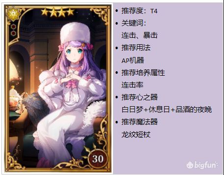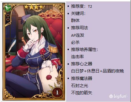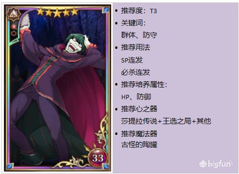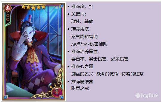 被动开局给4点AP并且减少我方队友冷却中的SP技能1回合CD。在输出核心携带银质假面的情况下,再降低一回合冷却。尽管只能在某些副本第二面减少友方的CD,但是也给了那些3回合CD的SP技能连发一次的机会!当然前提是你的输出足够秒图,她只能减冷却中的CD。AP技能只消耗一点AP点,提高30%的攻击力和20连携,增幅很高SP技能全体回怒气300,可以加速怒气周转(孔明是你吗孔明?)。既然要辅助,那当然要贯彻到底咯。队伍重AP魔法器选龙纹手杖,重必杀则用银质假面加速怒气周转。都没有的话建议撑肉带古怪的陶罐当作嘲讽用。