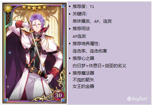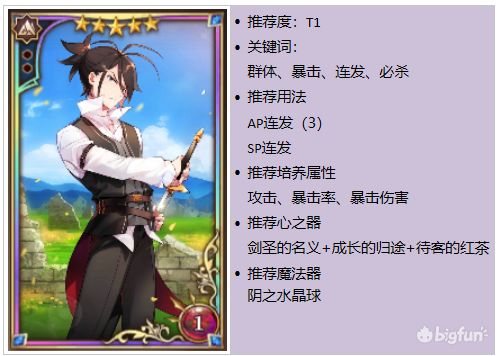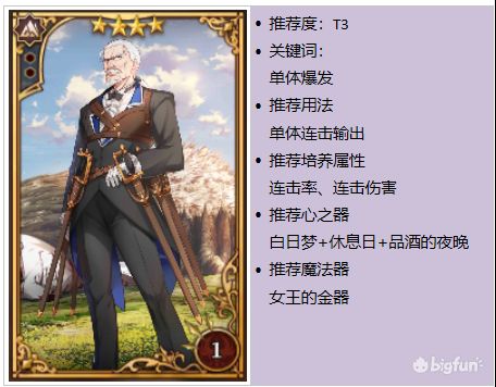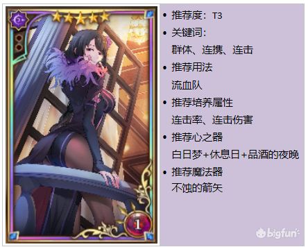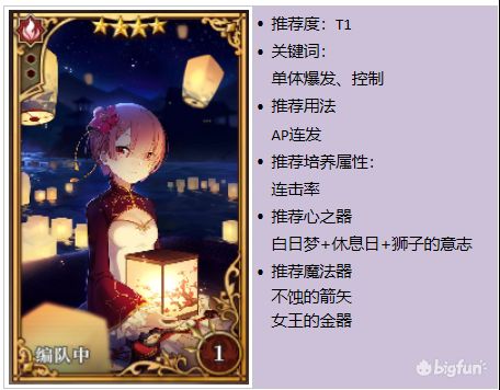 单个角色评价T0,最强力的角色,后期在周回本和挑战本中都有亮眼的发挥。一个暴击打手,两个连击打手,一个纯辅助。