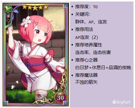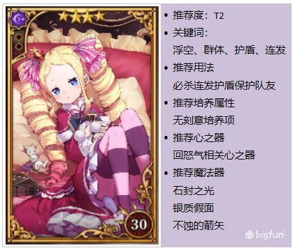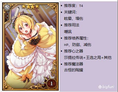 初期四星爱蜜莉雅暴击率不足时最好的伙伴。在后期可能就显得不那么实用了,因为SP技能倍率太低,打手们不如自己堆暴率,然后换一个更好的伤害辅助。