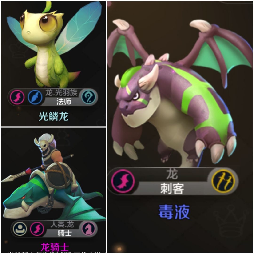 5.特点:三龙的上场满蓝十分imba,二星毒龙大招基本能秒掉对方一个棋子,puck的aoe,最重要的是龙骑开场变身,提供大量dps,溅射伤害也很乐观,加上优质的骑士前排,阵容十分强大。但是由于卡位要求过多,只剩两个空卡位过于自闭,相对不那么灵活,并且极度缺少控制技能,甚至九人口前可能都不会有控制棋子上场。