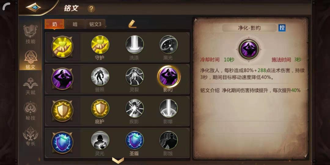 影耀-圣愈:持续回血8秒暗袭:配合40级天赋灵魂共鸣有50%机率为周围队友提供5%连击率