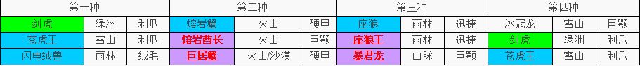 第一种:绒毛*3、坚骨*3、雪山*4、雨林*2
