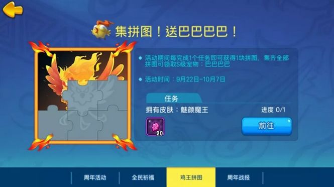 每完成1个任务即可获得1块拼图,集齐全部拼图可领取级宠物:巴巴巴巴! 对于期待了1年的鸡王,终于在周年庆现身啦!