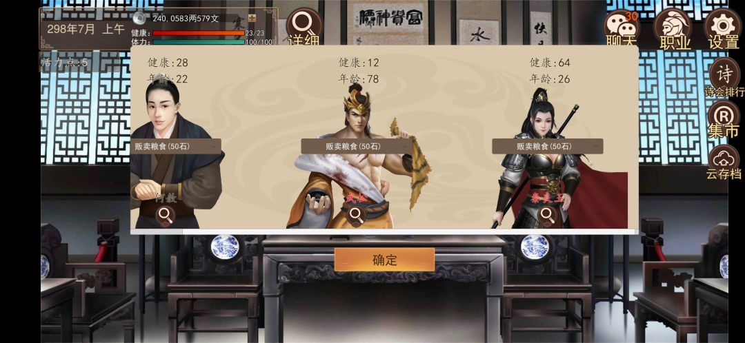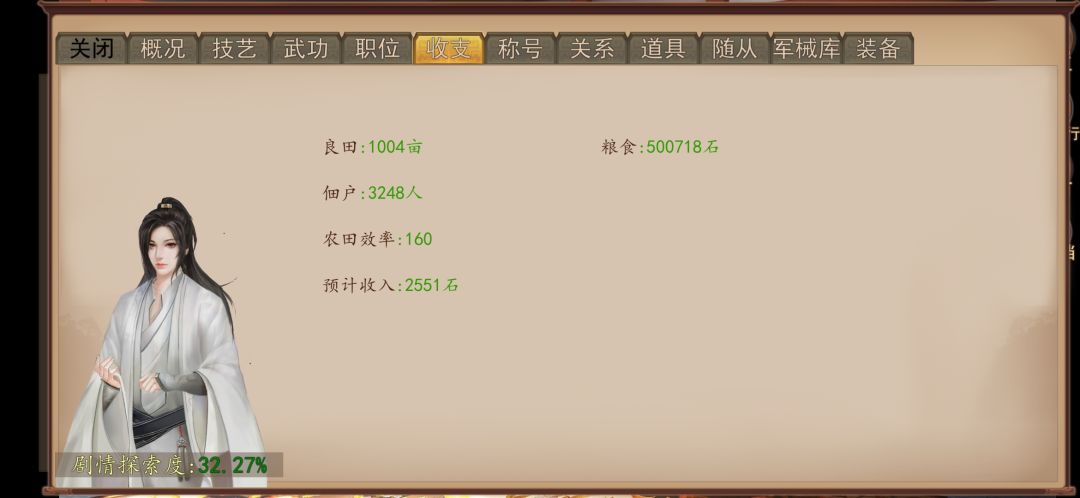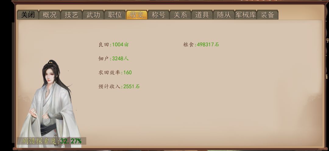 手上银两变为2400583两,对比上个月的2321346两,多了79237两,减去1239两的固定月收入,实际卖粮所得77998两。和之前显示的预计月收入没有太大误差。