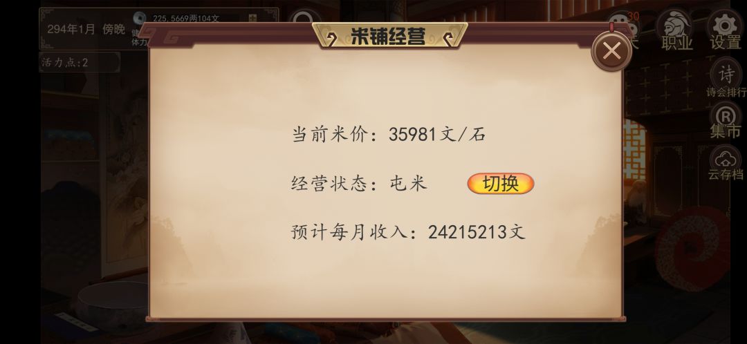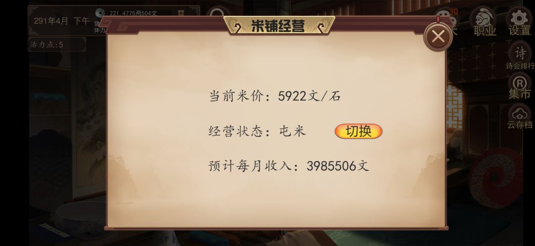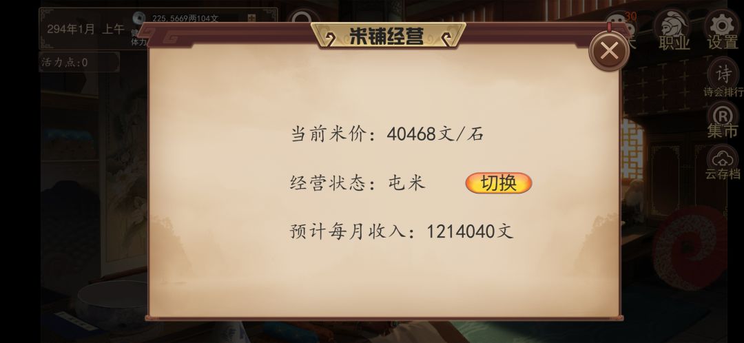 首先米铺可以选择屯米或卖米,屯米价格(每旦粮食的价格)会上涨,卖米价格会下跌。