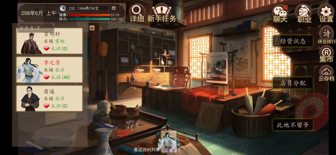 然后我清楚的记得之前游玩的时候,你如果一直屯米,就会触发一些事件,掌柜会告诉你最近大丰收,所以粮食价格回落,或者最近粮食涨价太厉害了,官府要求你开仓放粮,你可以选择方粮(卖米),或者花10金条打点官府继续屯到更高的价格。然后你要是一直卖米状态,偶尔会触发价格回升的事件,以及自然灾害事件,粮价飙升,你可以选择开始屯高价,或者选择继续赈济灾民,掌柜会说你宅心仁厚自愧不如。