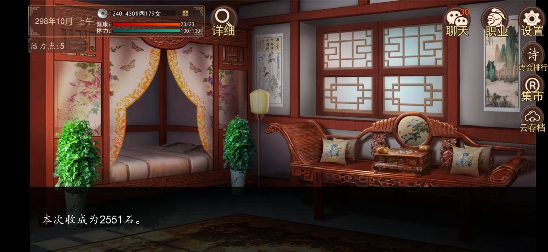 屯米一月后,298年6月,手上银子2321346两,对比上个月的2320107两,多了1239两。差不多就是私塾+县令一个月的收入。那么,是不是这1239两就是县令+私塾收入呢?我们回个档