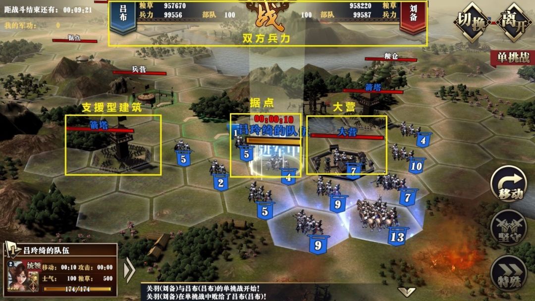 战场中双方势力都有支援型建筑。比如“箭塔”就会在敌方部队接近时自动攻击,伤害可不低哦,各位主公要小心选择进攻路线。