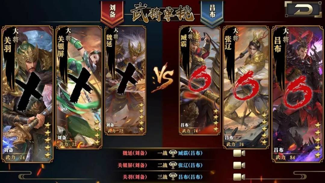 正式开战前会先进行双方势力的武将单挑。每个势力由3个玩家参与,每个玩家选择一位武将与对方势力的武将进行单挑。比如一个势力由A,B,C武将组成,另一个势力由D,E,F武将组成,则A与D,B与E,C与F分别单挑,胜负机制为3局2胜制。