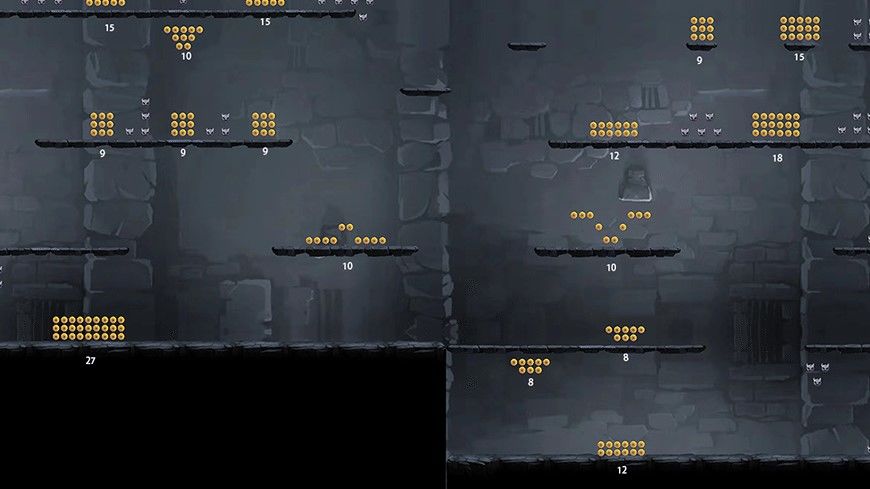 没数错的话金币是有2548枚,恶魔金币是336枚,金币袋有38个(金币袋里的金币是有不一样的,而且走传送门时会有金币掉太远吸不过来的情况,只能大概估计下有740枚),金币的能数的都有在全景图里标明,可以方便大家选择路线。