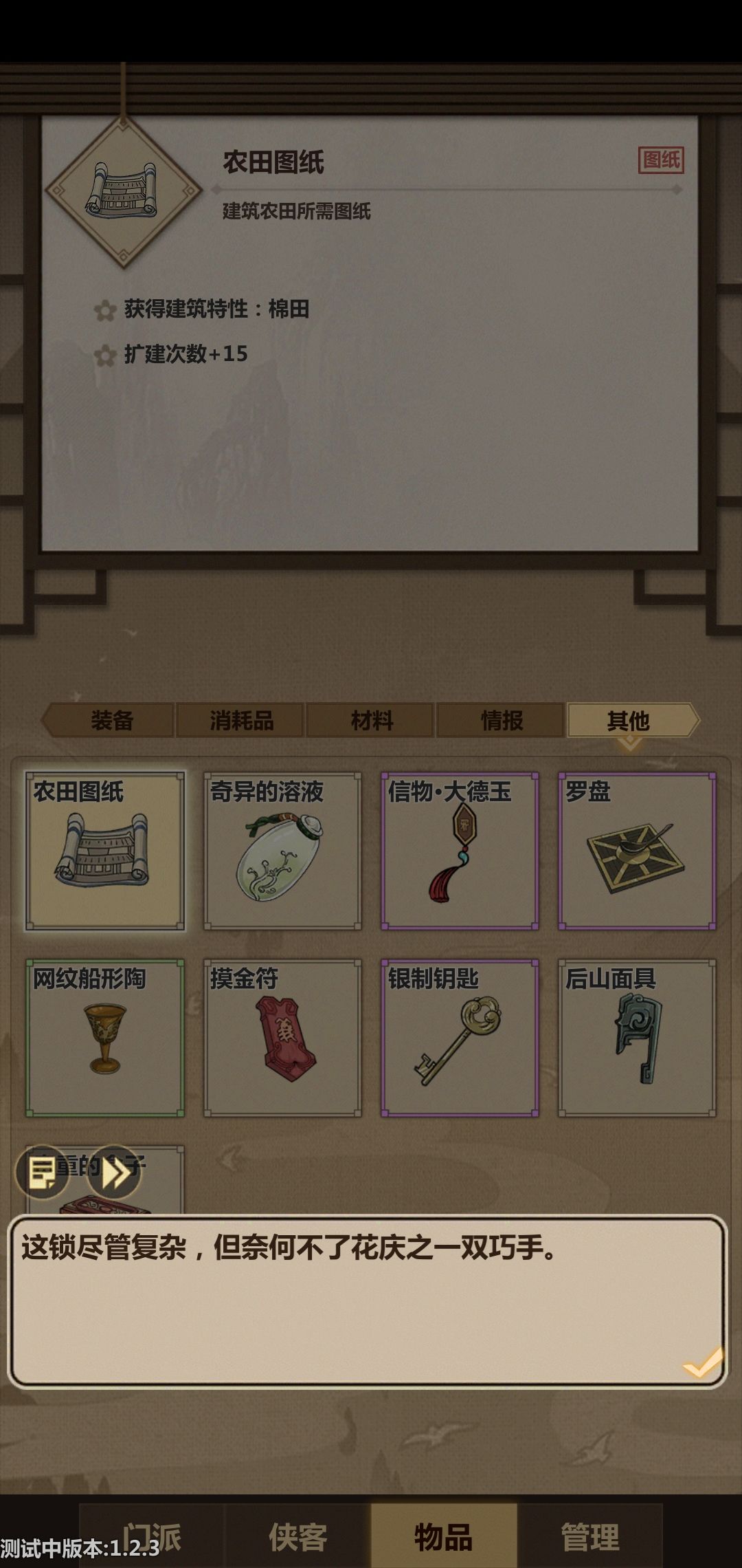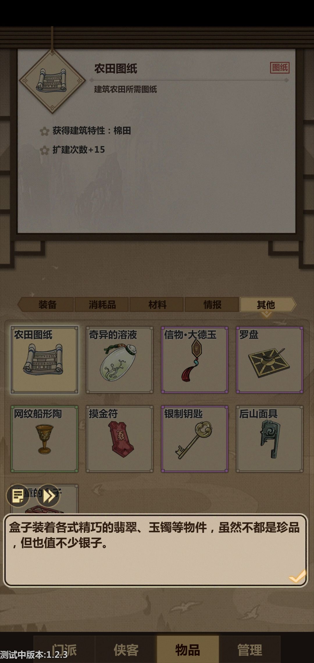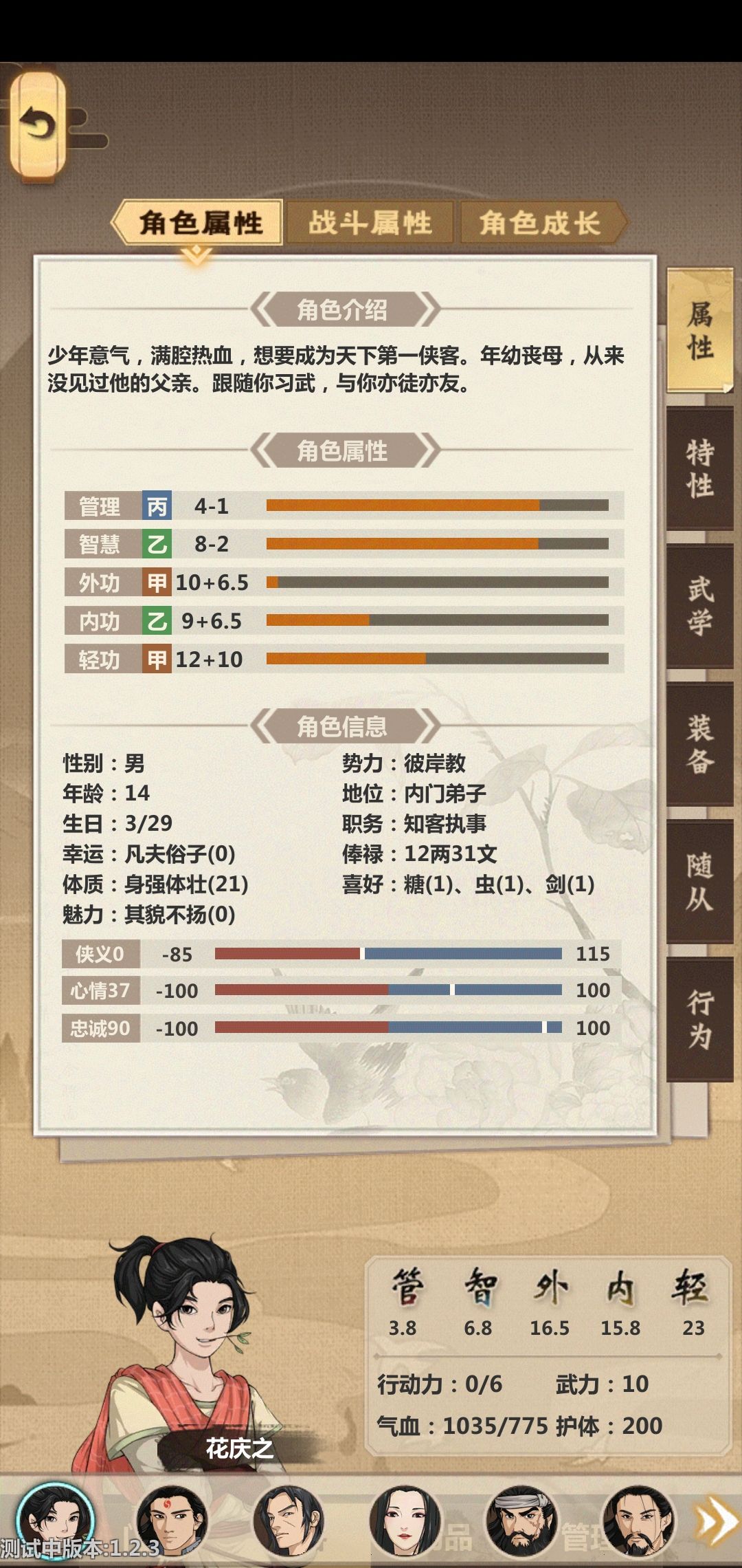 老规矩,碰到不认识的东西先存个档,然后拿弟子去试,发现想不破坏箱子打开箱子必须要有足够高的轻功,于是拿我弟子中轻功最高的庆之进行尝试