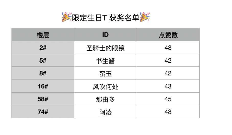 恭喜以下六位小伙伴获得了本次Pururu庆生超限定纪念T恤哦~留意你的在本帖的留言