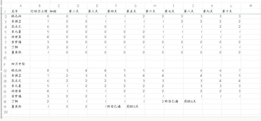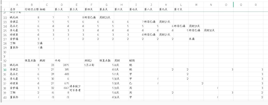 第一张表格图,第二张表格图上半部分详细记录就体力的恢复时间。第二张表格图左下角统计总耗时及平均耗时,右下角做了测试二,在体力上限相同时各个英雄的恢复速度。