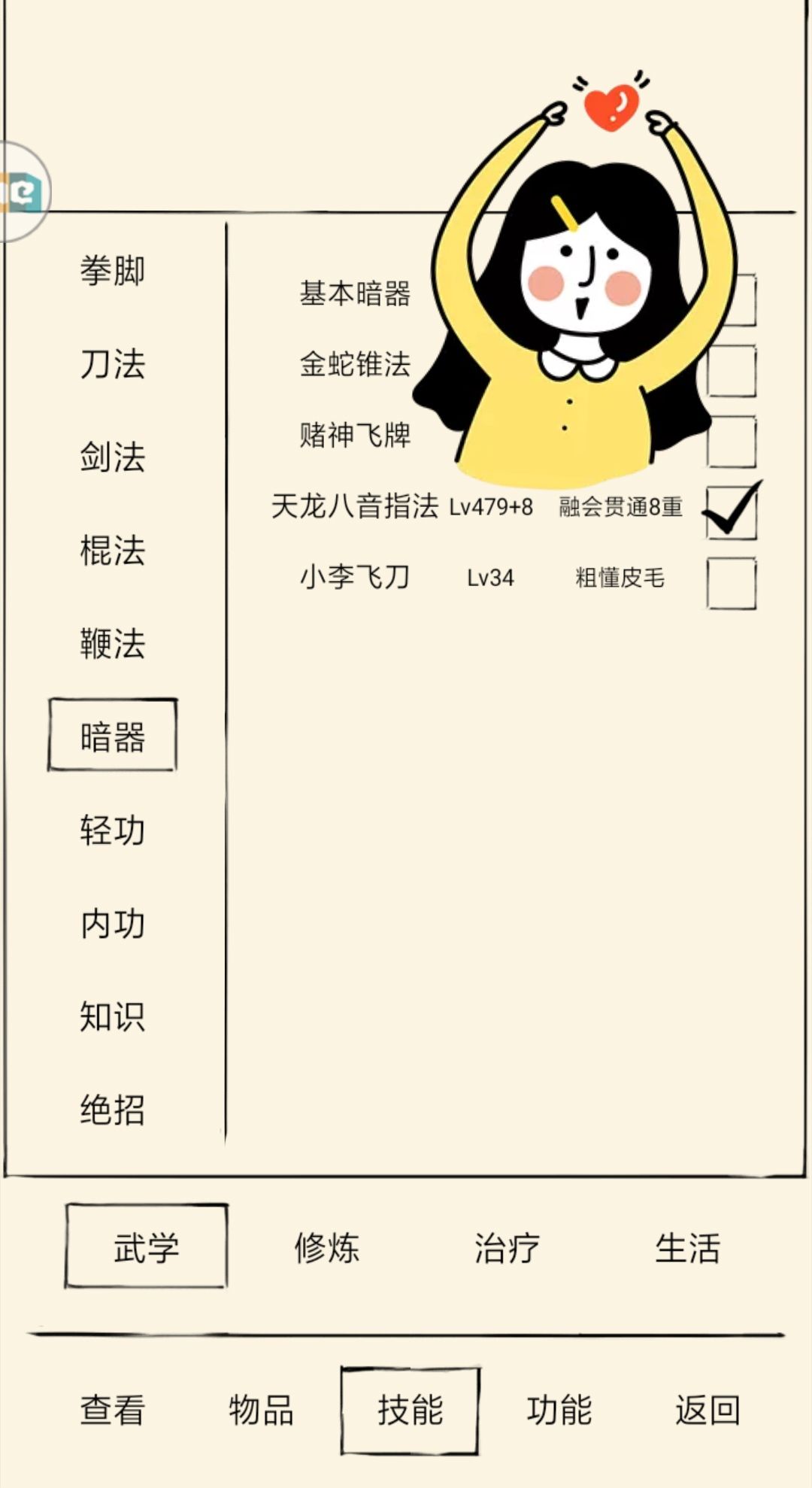 8.喜欢暗器可以选择小李飞刀,喜欢悟性绝学可以选择两仪剑.如果不是因为喜欢,不要选择天龙八音作为主用的外功.