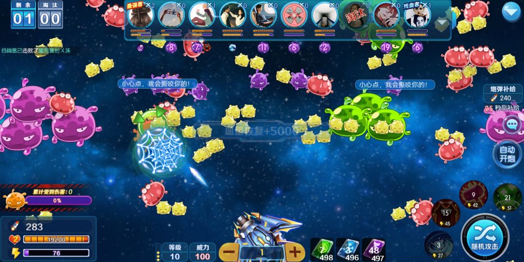 打击病毒,病毒死后可产生伤害值,伤害值累计1000就会释放伤害病毒,会攻击你的对手。生命值为0时,就会被淘汰。