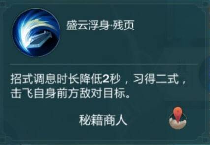 这里推荐携带残页秘籍因为可以二段的声韵浮生是可以集中一些浮空角色,比如果雪月上的杨宁,在二段跳的高度以内浮空的一些角色,基本上都可以被二段打到,同时他也是一个不错的控制,可以接上弑王十步打上连续的控制,如果不是特别习惯的话,携带剑气的秘籍也是可以的。