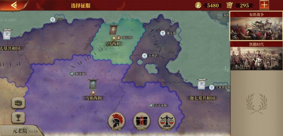 5.剩下3组部队委任好将领,先在古达米斯灭掉东边来的部队,然后向北攻占卡普撒。(这时主城压力没那么大了,可把守城精锐拉去进攻)。卡普萨之后希尔塔,之后迦太基。这一步最关键,做不到就重开。