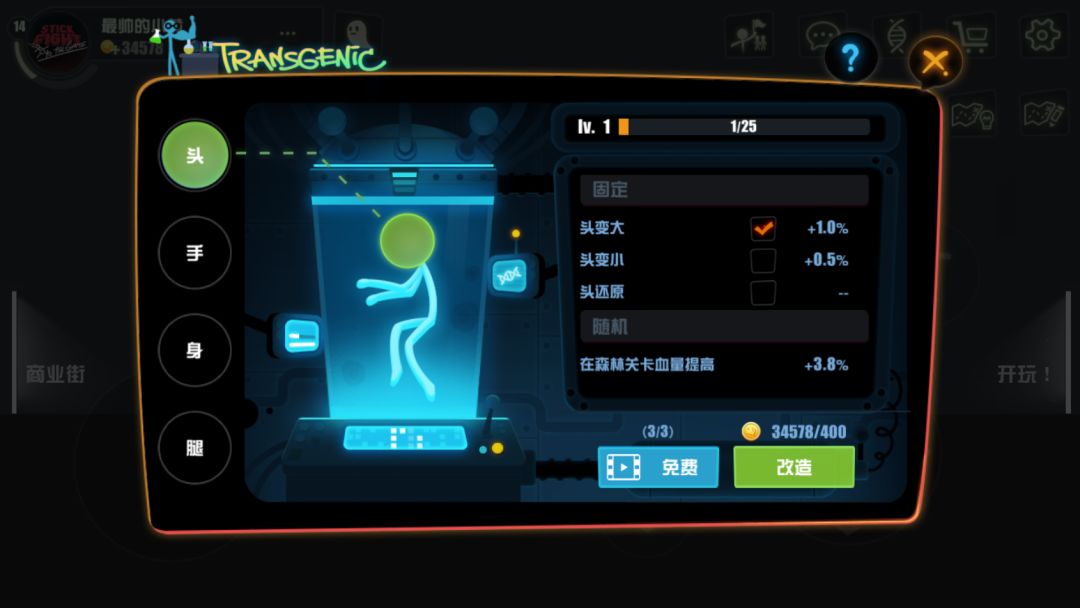 解锁基因系统后,兄dei们可以对自己的角色进行改造,让火柴人变得更加强大,战无不胜。