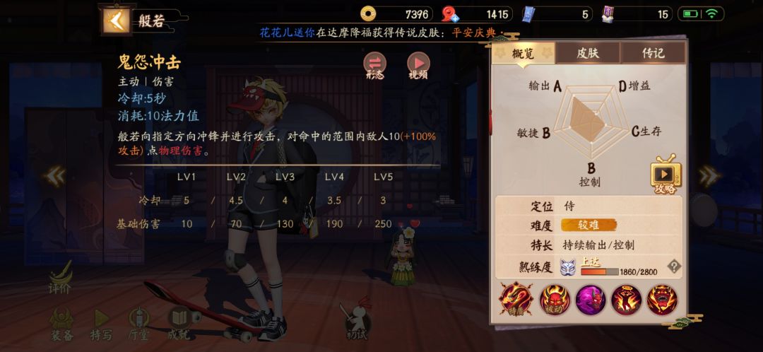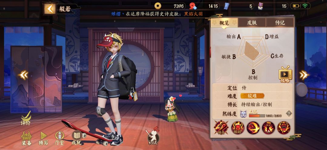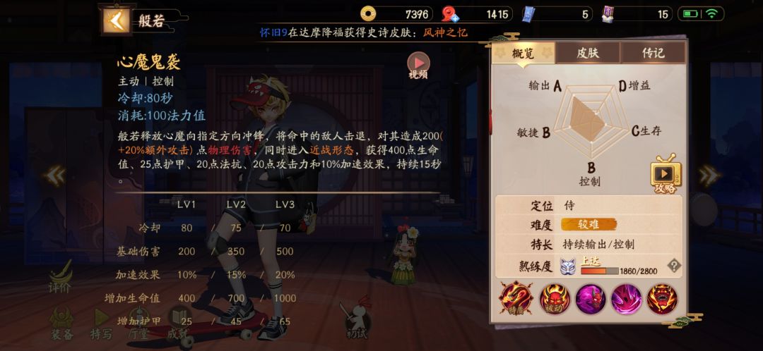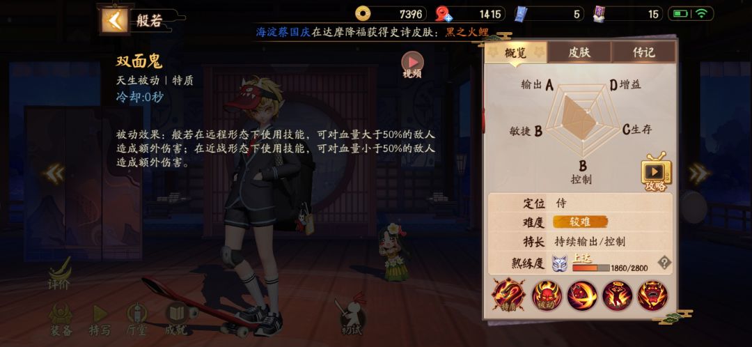 团战方面个人打法:喜欢等对面c位露头二技能减速接三技能突进,控制了一套带走,不过大多数情况也需要队友的一些配合,否则很容易造成孤身一人未出师而中道奔卒,这也是般若、狸猫等开团类式神的短板之处。
