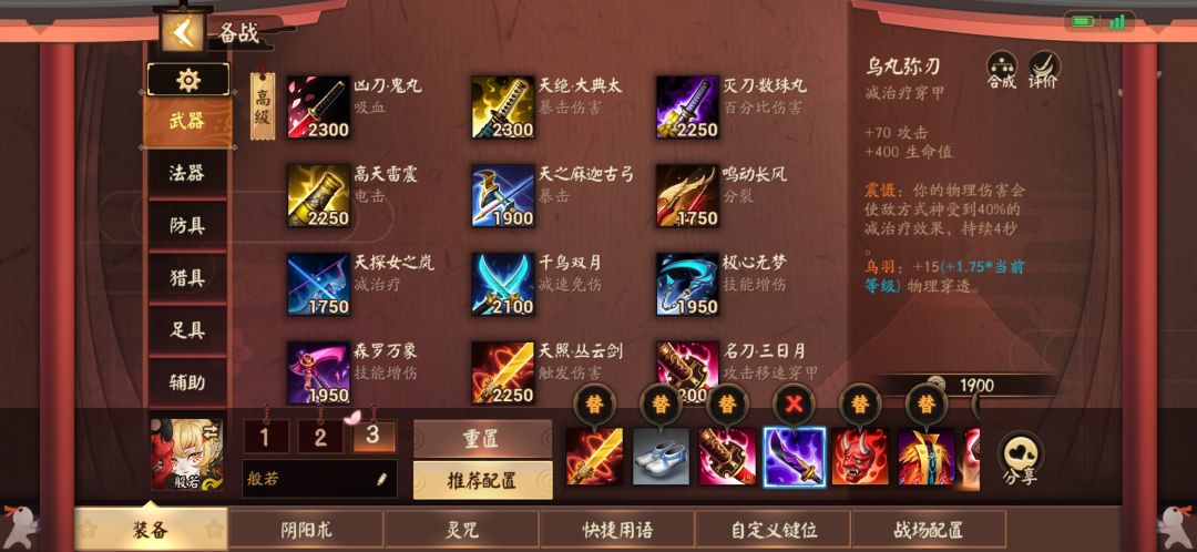 首先,【天丛云】般若的核心装备,完美贴合了般若技能释放触发被动的机制,般若爆炸伤害的关键。【水银鞋】与一些护甲鞋不同之处便是35%的控制减免,如果是辉夜姬之类的辅助或者稳定控制的中单,推荐出一波。护甲鞋水银鞋根据阵营酌情选择。这里前期推荐草鞋过渡,如果你经济比较优势可以出整件【名刀三日月】提供穿甲移速攻击加成,一定程度提高了坦度。【减疗甲】对射手的吸血起制裁作用,以及触发被动后的范围减速。【新变动】这里提下,减疗甲可以用乌切替代,不过这种算是走偏向输出的路径不是顺风不推荐出【鬼相护面】这次装备变动最大的受益者,具体什么效果想必也都领略到了吧。很恶心,这里我就不细讲了。这也是这次主要修改的内容【九天穹之翼】由于现在魔物混伤流射手都较为强势(百目鬼,桔梗,白狼,御馔津),这件法抗装的特性在对抗常规的法师伤害上也一定程度削弱了部分射手的法术混伤。【罗刹王】也就是俗称锤子的玩意,强切c位的时候可以抵挡一定程度的控制。