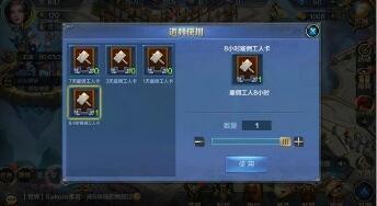 在每个主君的城市里,只有一支建筑施工队伍,而当主君用这支队伍给这座建筑升级时,就不能同时给另外的建筑升级了,这样会大大降低建筑升级的效率和速度。不过,主君们可以另外雇佣工人,使用雇佣工人卡就可以再雇佣到一支建筑施工队伍了,雇佣工人卡可以用钻石购买,有长期的的有短期的,就看各位主君如何选择啦!