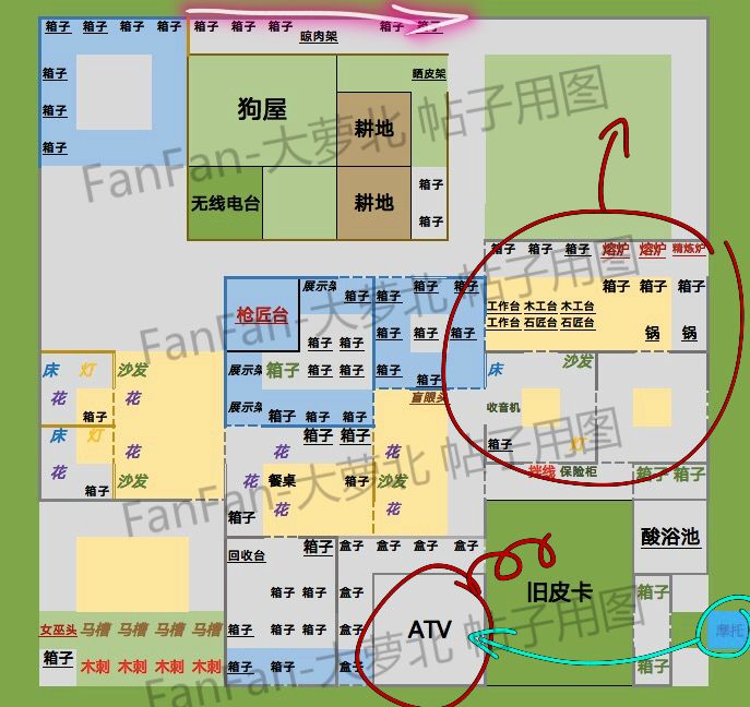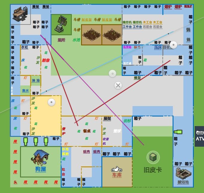 由于版本背刺过于严重,锅、晾肉架、制皮架等都不能放在地板上了,冶炼区可以考虑和挖矿机等融合。