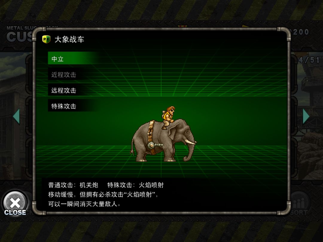 这是游戏中的大象战车,它移动缓慢,但却拥有必杀攻击“火焰喷射”,可以一瞬间消灭大量敌人。它的原型也是取材于战争中的大象,不过近代战争中的大象却不是用于攻击,而是用于运输战争物资,或者驮运士兵。在古代的话,其实可以用来震慑敌人。在《合金弹头反击》中,大象战车仍然延续前几代中的造型,不过玩法却发生了变化。具体的操作方法,还是期待你的亲自探索。
