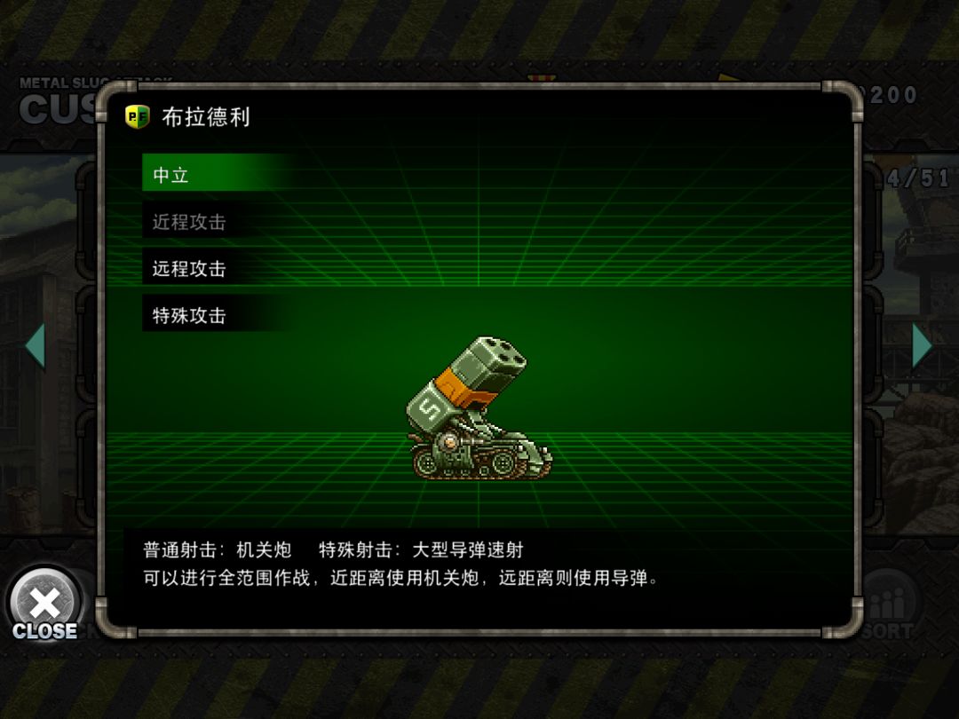 合金弹头反击中的这种小型导弹车看似身材矮小,但是可以进行全范围作战,近距离使用机关炮,远距离使用导弹。但是和现实中的导弹车进行比较,它更加的灵敏。它的行走方式不是传统的四轮驱动,而是采用传送带的方式进行行走。在合金弹头系列游戏中,它是可怕的对手,但是在《合金弹头反击》中,它却是你的合作伙伴,帮助你共同面对敌人。