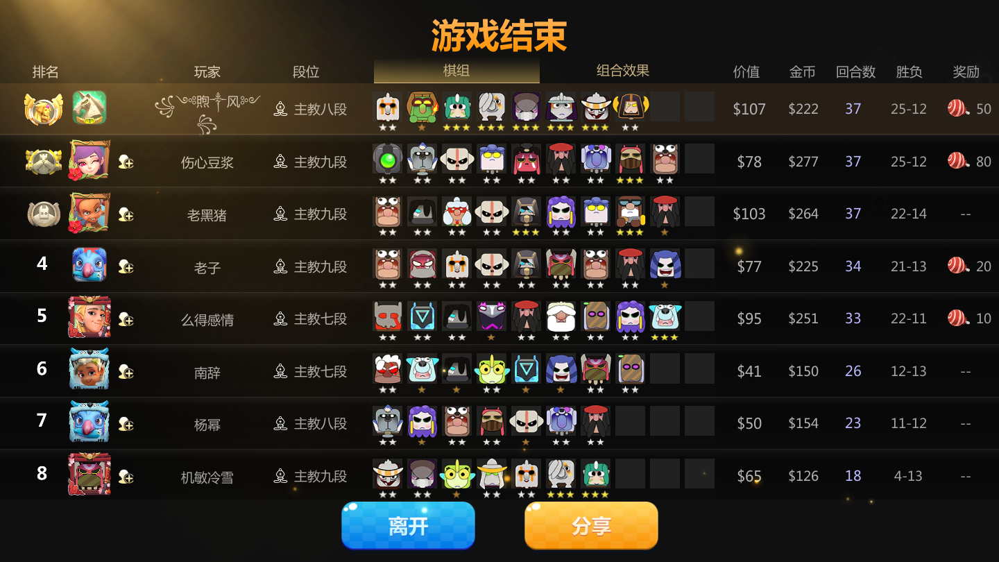 我和倒数第一名都是空城德,他先空,我6回合也空了断他连败,后面我连败+2时也被他断了。他先来爪我先来树,算是平分春秋。之后好不容易熬死他,我想爪总要来了,没想到到死不来一个,最后靠着全部手动的三星和炸弹人各种走位躲神法和成型战猎,终于在37回合带飞两家天胡,2血吃鸡~