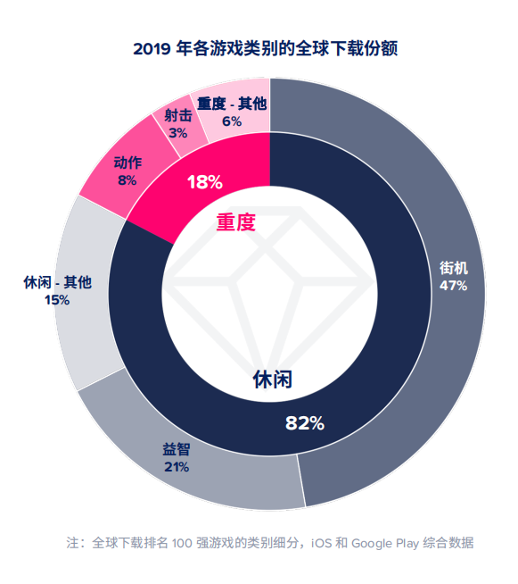 2019 年重度游戏的下载量占比位18%,却拥有 55% 的使用时长份额。玩家逐渐接受在移动端体验重度游戏。