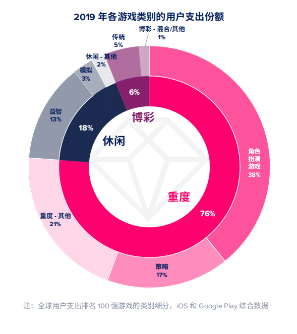 重度游戏也带来了更多的营收份额,在移动游戏中,重度游戏收入占比 76% ,在中国、日本和韩国等亚太区主要市场,重度角色扮演、策略和动作游戏的总用户支出占据了游戏市场的半壁江山。西方市场的增长重心开始向重度游戏偏移。
