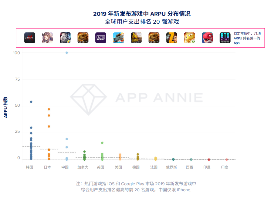 在App2019 年新发布的游戏中,韩国 ARPU 值(每用户平均收入)居于首位,日本和中国紧随其后。