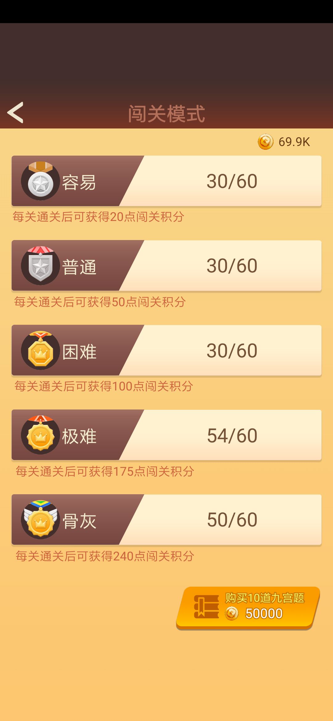 更新个建议哈,闯关模式可以让玩家选择要买的难度吗?就我个人而言只想玩极难和闯关模式,然而每次买10道都打包,很浪费金币啊。。。。也不知道怎么定价的。。。。