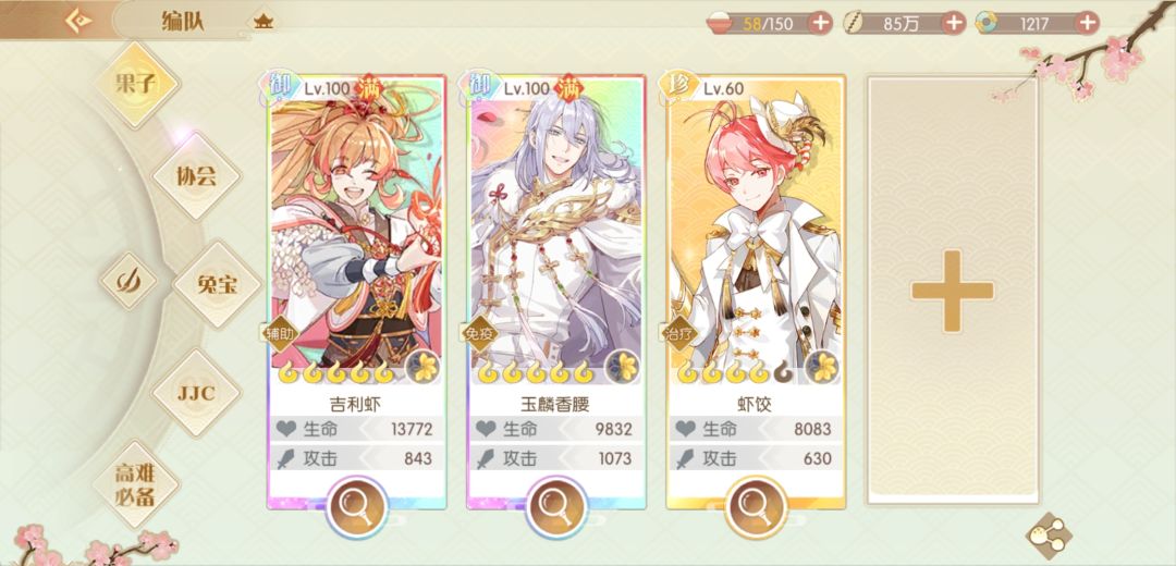 最后一位可选任意单体(我用的猪弟蹭经验,可见该阵容对单体需求之低)膳具:两只虾堆血(有玛瑙最佳),腰子和单体可用爆伤、暴击和青白玉(堆伤害)优点:极其稳定,不易翻车。虾饺的平A带破甲,对四号位也有较强辅助效果缺点:1.在8-10回合结束,太慢2.要求练度太高3.腰子和吉利虾毕竟不容易获得