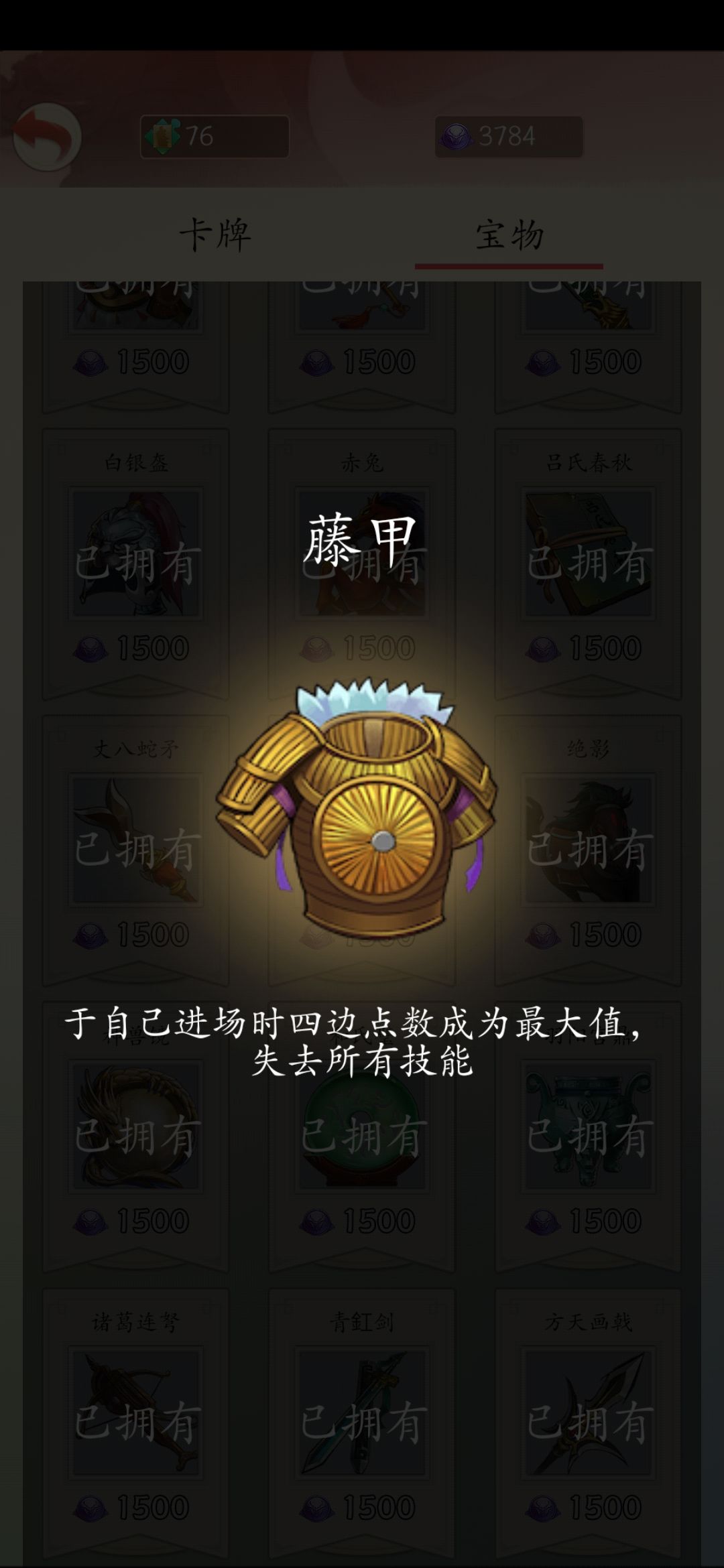 实战评析:卡等越高,武将技能越多,佩戴藤甲则失去的技能也越多,而且还要站一个宝物格子,来换取4维最大,整体收益是亏的。