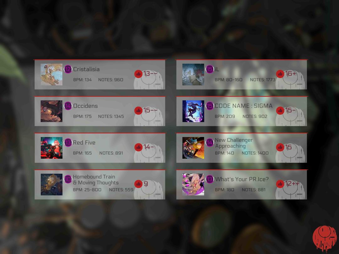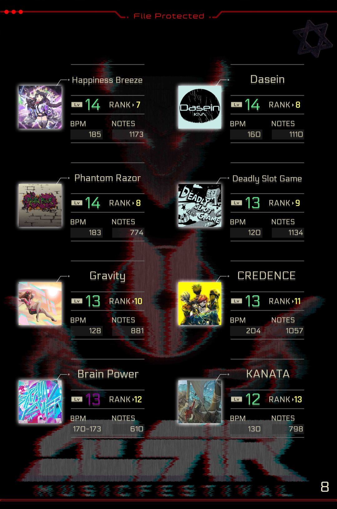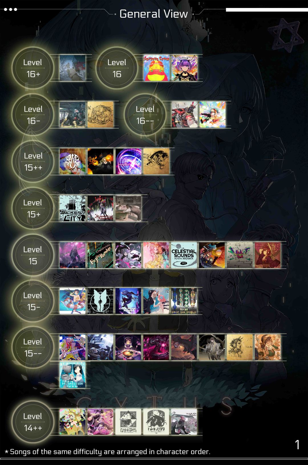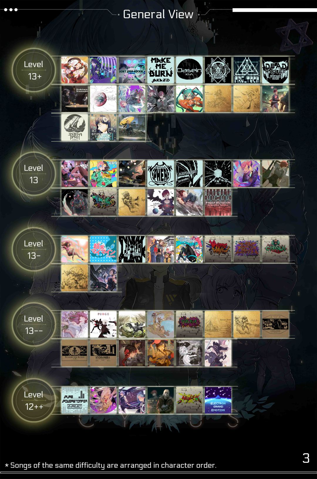 3.对于比较特殊的谱面如《Brain Power》CHAOS谱面和GLITCH谱面,本难度表使用排序法进行标级。