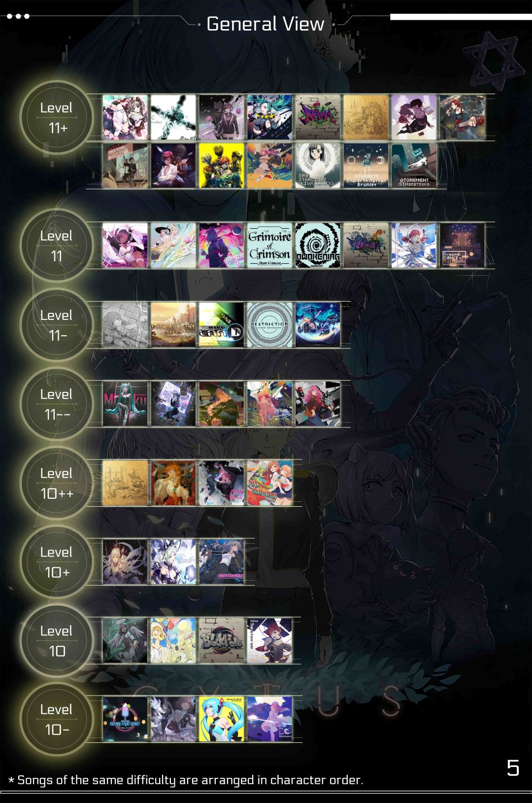 2.本难度表将CYTUS II官方的每一个等级(例如12)分成了五档:12--、12-、12、12+、12++。每个等级的最上位(12++)难度低于下一个等级的最下位(13--)。