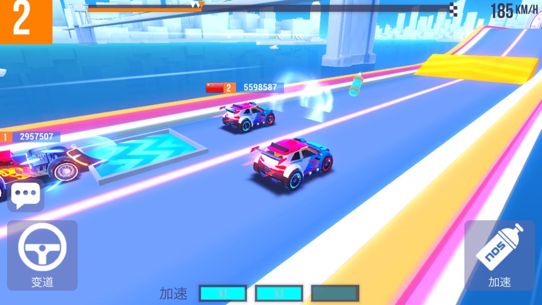 游戏操作简单,只需要左手点击换车道和旋转车右手使用氮气加速即可以进行游戏。虽然只有两个按键,但游戏加速、跳跃、漂移等各种技巧也很齐全,你甚至可以发挥赛车极限,将对手赶出跑道。