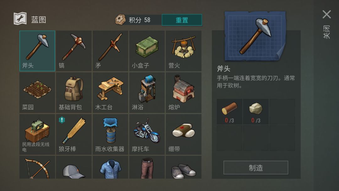 斧子:获取木头,砍伐墙壁的工具。应急必备。