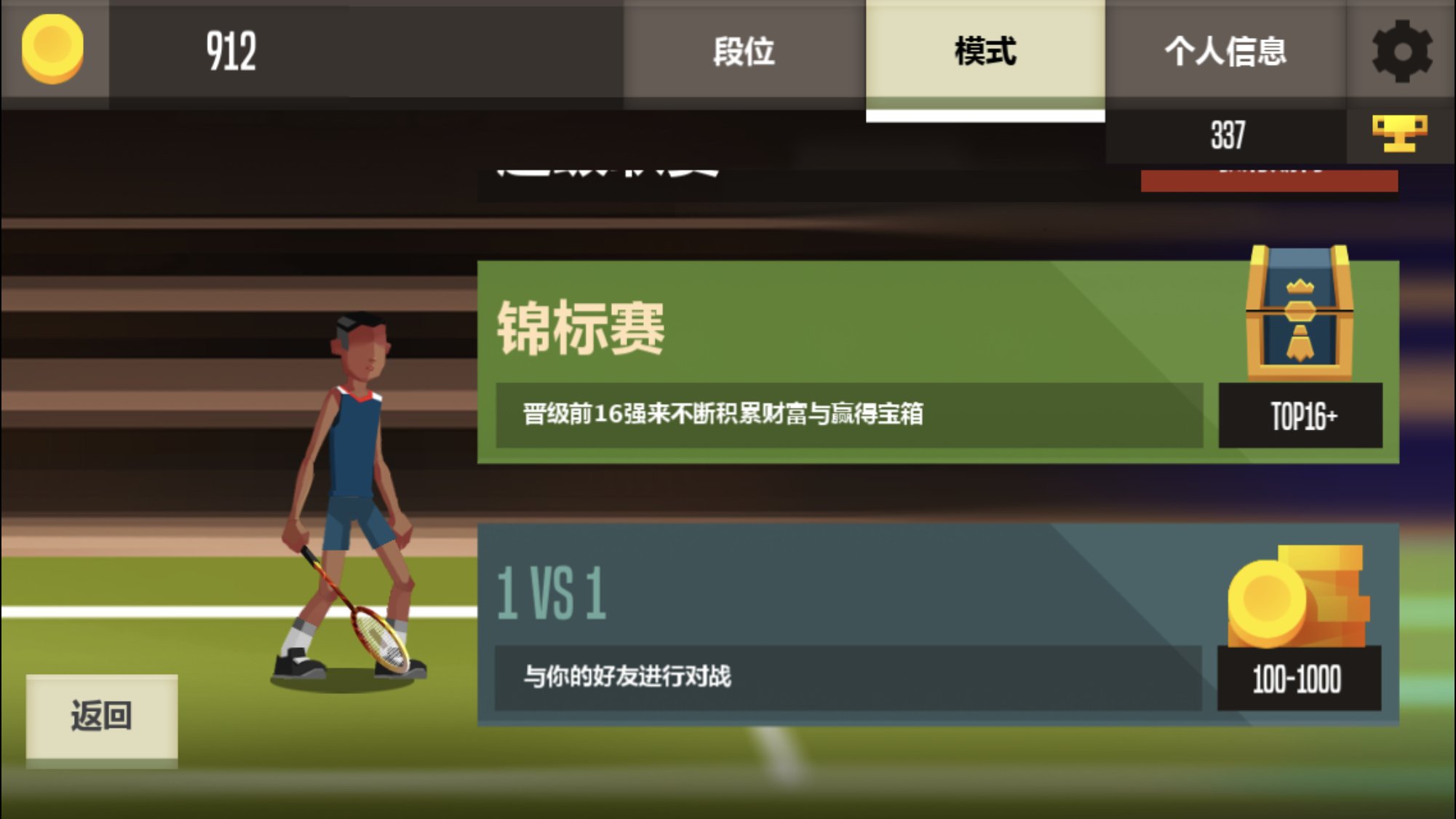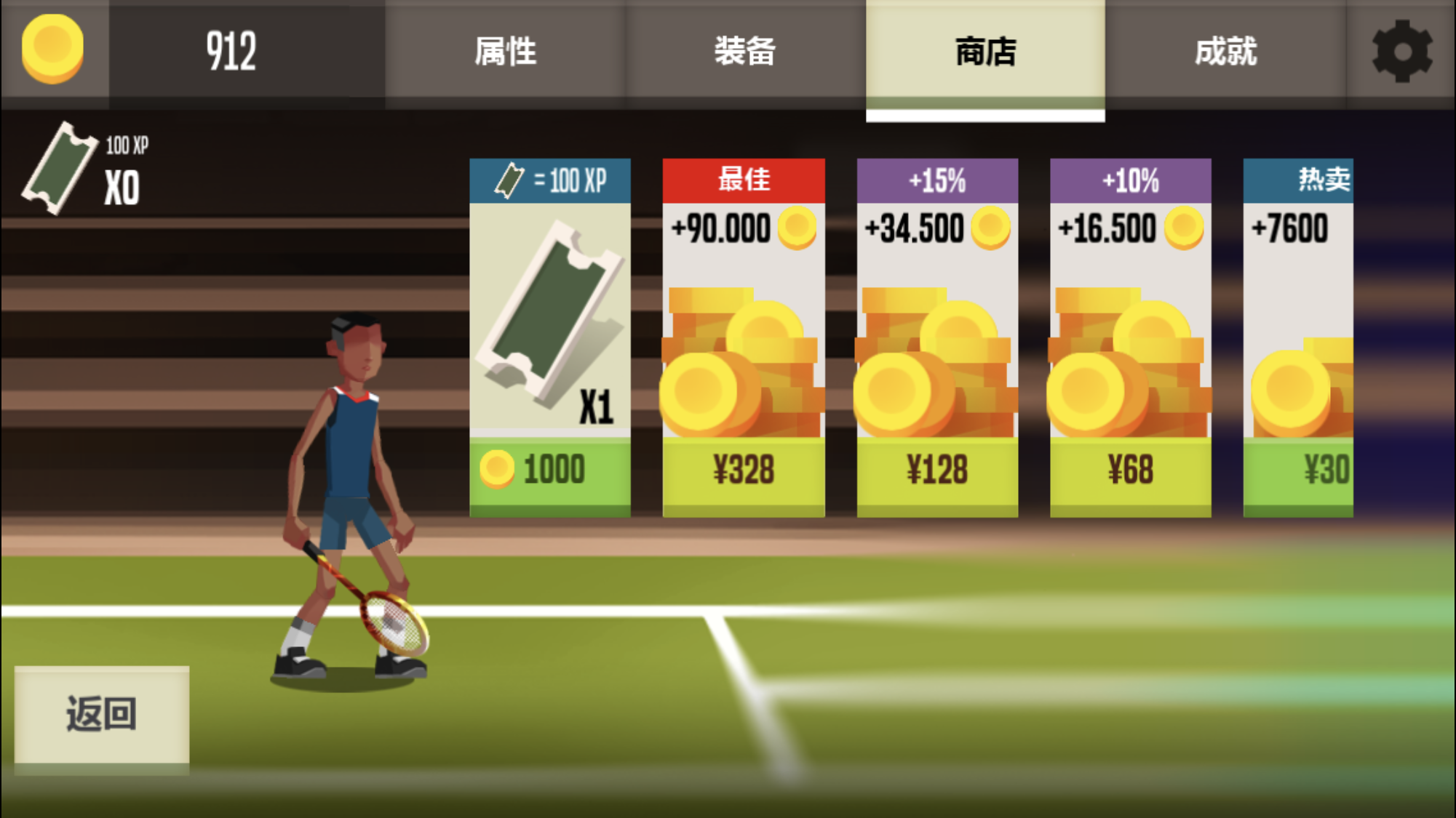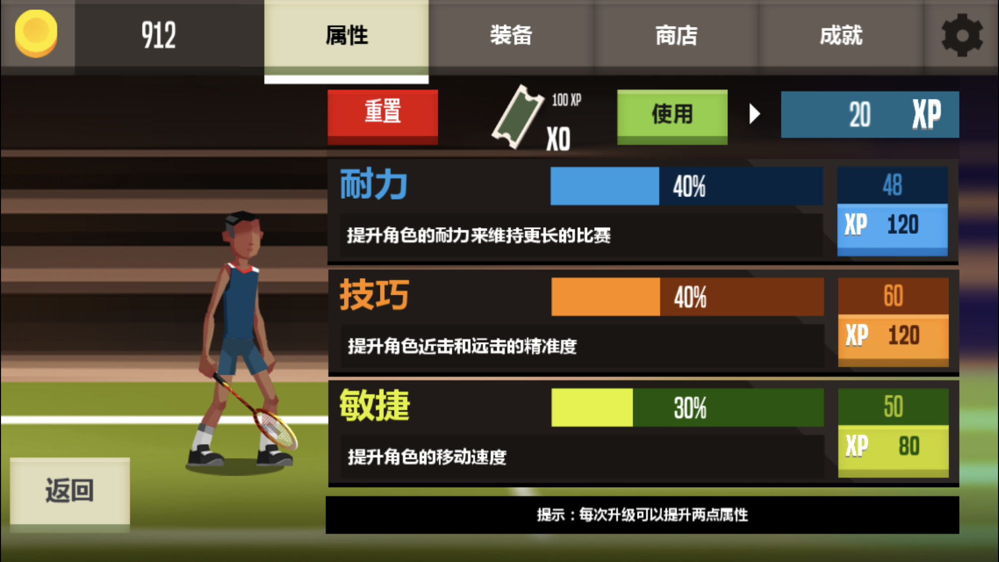 除了对局操作带来的刺激,他还有养成的概念。你可以通过对战获得金币和经验,用来购买装备和提高属性。提高耐力属性在高端局中很有用,每次挥拍都要消耗耐力,如果两方都是高手一直不失误,那么最终拼的就是耐力了;提高技巧属性能够让回击的角度更刁钻;提高敏捷就是跑得快,进攻和防守都用得上。这里个人建议先提高技巧属性哈。