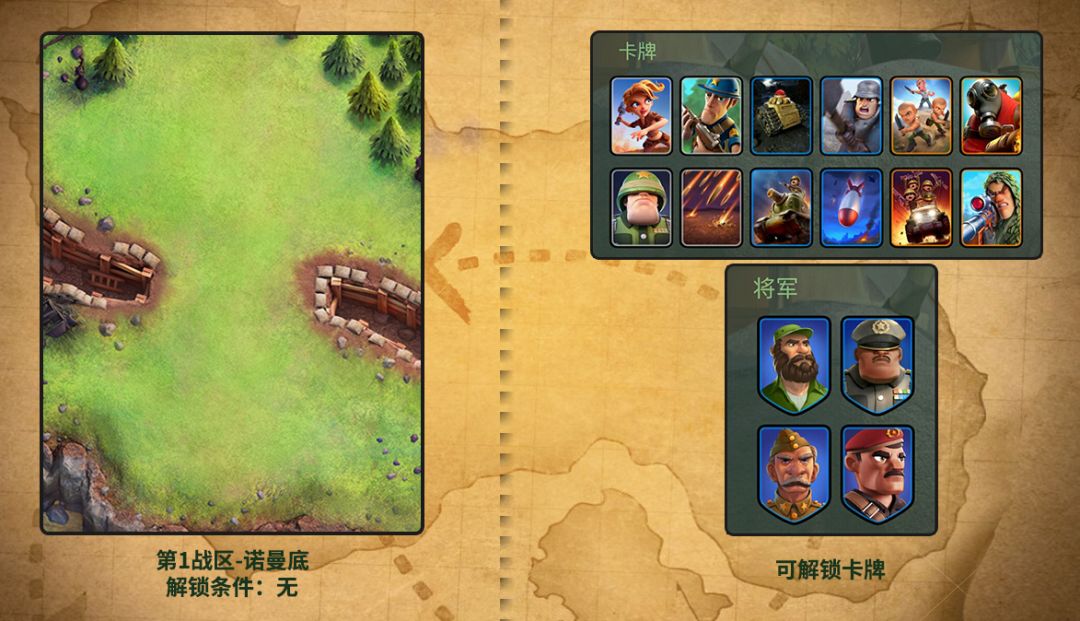 战区是玩家进行对战的地图,每个战区都有不同的障碍物或地形。当玩家获得一定的勋章时,可以解锁新的战区。战区等级由当前的勋章数量所决定(通过对战获得勋章)。玩家所在战区等级越高,可解锁的卡牌数量越多,且可以在军需箱中获得更多奖励。目前《战区英雄》中共有7个战区。
