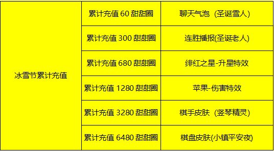 活动5:冰雪节累计充值送好礼。最低累计充值60就可获得聊天气泡,最高累计充值6480获得珍贵小镇平安夜棋盘皮肤。奖励总计6档,更有圣诞老人连胜播报、绯红之星升级特效、苹果伤害特效等节日奖励。
