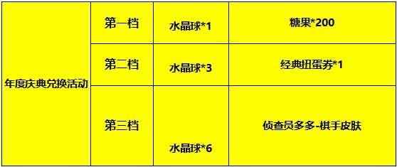 活动2:水晶球兑换活动。活动期间,玩家在对局中会随机掉落水晶球,可以兑换糖果*200、经典扭蛋券、侦查员多多皮肤。
