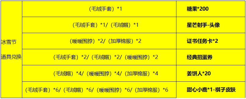 活动3:冰雪节道具兑换。活动期间,玩家对局后会随机掉落加厚棉服、毛绒帽、毛绒手套游戏道具,可兑换糖果*200、星芒射手头像、证书任务卡*2、经典扭蛋券、姜饼人*20、甜心小鹿棋子皮肤。节日气氛满满!