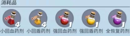 还有小回血、回盾药剂各4个,强回血、回盾、全恢复药剂各1个,只为让你战个痛快!